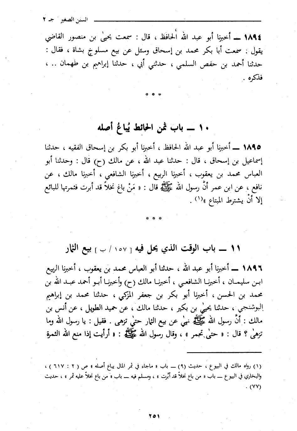 1895 - أَخْبَرَنَا أَبُو عَبْدِ اللَّهِ الْحَافِظُ، نَا أَبُو بَكْرِ بْنُ إِسْحَاقَ الْفَقِيهُ، ثنَا إِسْمَاعِيلُ بْنُ إِسْحَاقَ، قَالَ: ثنا عَبْدُ اللَّهِ، عَنْ مَالِكٍ، قَالَ: وَحَدَّثَنَا أَبُو الْعَبَّاسِ مُحَمَّدُ بْنُ يَعْقُوبَ، أَنَا الرَّبِيعُ، أَنَا الشَّافِعِيُّ، أَنَا مَالِكٌ، عَنْ نَافِعٍ، عَنِ ابْنِ عُمَرَ، أَنَّ رَسُولَ اللَّهِ صَلَّى اللهُ عَلَيْهِ وَسَلَّمَ قَالَ: § «مَنْ بَاعَ نَخْلًا قَدْ أُبِّرَتْ، فَثَمَرَتُهَا لِلْبَائِعِ إِلَّا أَنْ يَشْتَرِطَ الْمُبْتَاعُ»