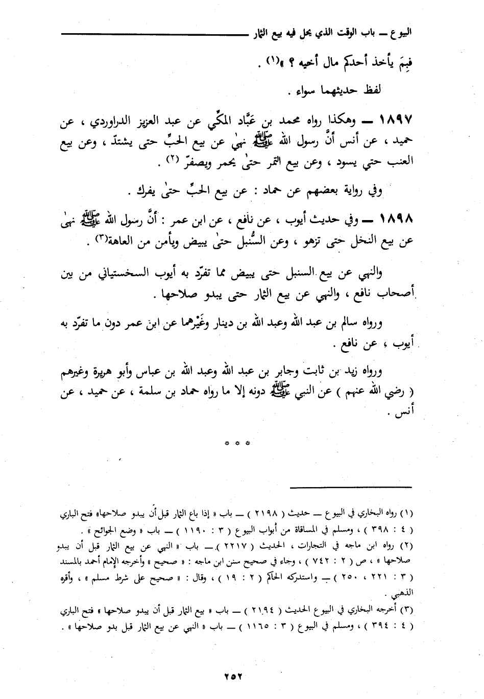 1898 - وَفِي حَدِيثِ أَيُّوبَ، عَنْ نَافِعٍ، عَنِ ابْنِ عُمَرَ: «أَنَّ رَسُولَ اللَّهِ صَلَّى اللهُ عَلَيْهِ وَسَلَّمَ §نَهَى عَنْ بَيْعِ النَّخْلِ حَتَّى تَزْهُوَ، وَعَنِ السُّنْبُلِ حَتَّى يَبْيَضَّ وَيَأْمَنَ مِنَ الْعَاهَةِ وَالنَّهْي عَنْ بَيْعِ السُّنْبُلِ حَتَّى يَبْيَضَّ» مِمَّا تَفَرَّدَ بِهِ أَيُّوبَ السَّخْتِيَانِيُّ مِنْ أَصْحَابِ نَافِعٍ، وَالنَّهْي عَنْ بَيْعِ الثِّمَارِ حَتَّى يَبْدُوَ صَلَاحُهَا. وَرَوَاهُ سَالِمُ بْنُ عَبْدِ اللَّهِ، وَعَبْدُ اللَّهِ بْنُ دِينَارٍ، وَغَيْرُهُمَا عَنِ ابْنِ عُمَرَ دُونَ مَا تَفَرَّدَ بِهِ أَيُّوبُ، عَنْ نَافِعٍ، وَرَوَاهُ زَيْدُ بْنُ ثَابِتٍ، وَجَابِرُ بْنُ عَبْدِ اللَّهِ، وَعَبْدُ اللَّهِ بْنُ عَبَّاسٍ، وَأَبُو هُرَيْرَةَ، وَغَيْرُهُمْ رَضِيَ اللَّهُ عَنْهُم، عَنِ النَّبِيِّ صَلَّى اللهُ عَلَيْهِ وَسَلَّمَ دُونَهُ إِلَّا مَا رَوَاهُ حَمَّادُ بْنُ سَلَمَةَ، عَنْ حُمَيْدٍ، عَنْ أَنَسٍ