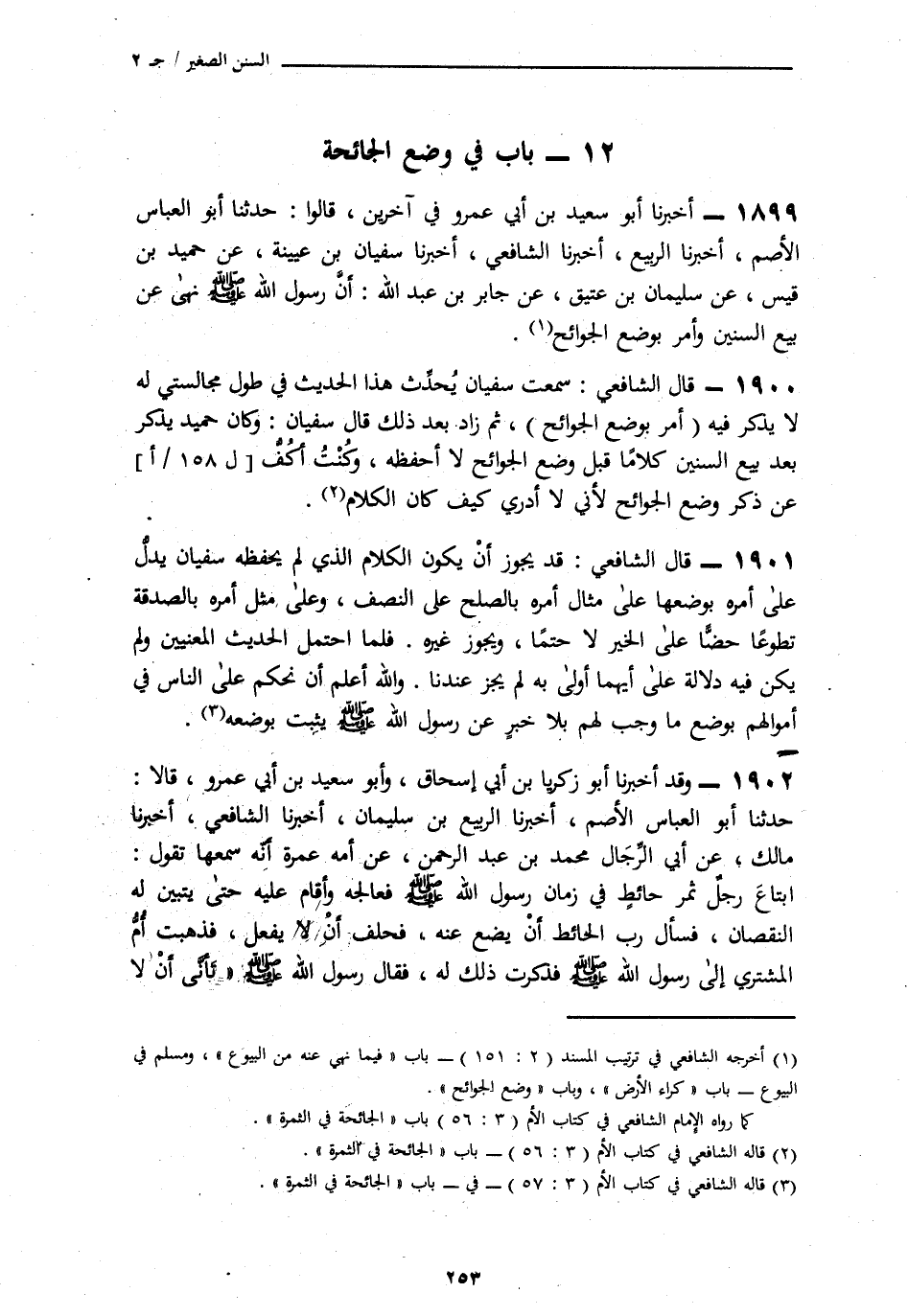 1900 - قَالَ الشَّافِعِيُّ: سَمِعْتُ سُفْيَانَ يُحَدِّثُ هَذَا الْحَدِيثَ فِي طُولِ مُجَالَسَتِي لَهُ لَا يَذْكُرُ فِيهِ «أَمَرَ بِوَضْعِ الْجَوَائِحِ» ثُمَّ زَادَ بَعْدَ ذَلِكَ. قَالَ سُفْيَانُ: وَكَانَ حُمَيْدٌ يَذْكُرُ بَعْدَ بَيْعِ السِّنِينَ كَلَامًا قَبْلَ وَضْعِ الْجَوَائِحِ لَا أَحْفَظُهُ، وَكُنْتُ أَكُفُّ عَنْ ذِكْرِ وَضْعِ الْجَوَائِحِ لِأَنِّي لَا أَدْرِي كَيْفَ كَانَ الْكَلَامُ