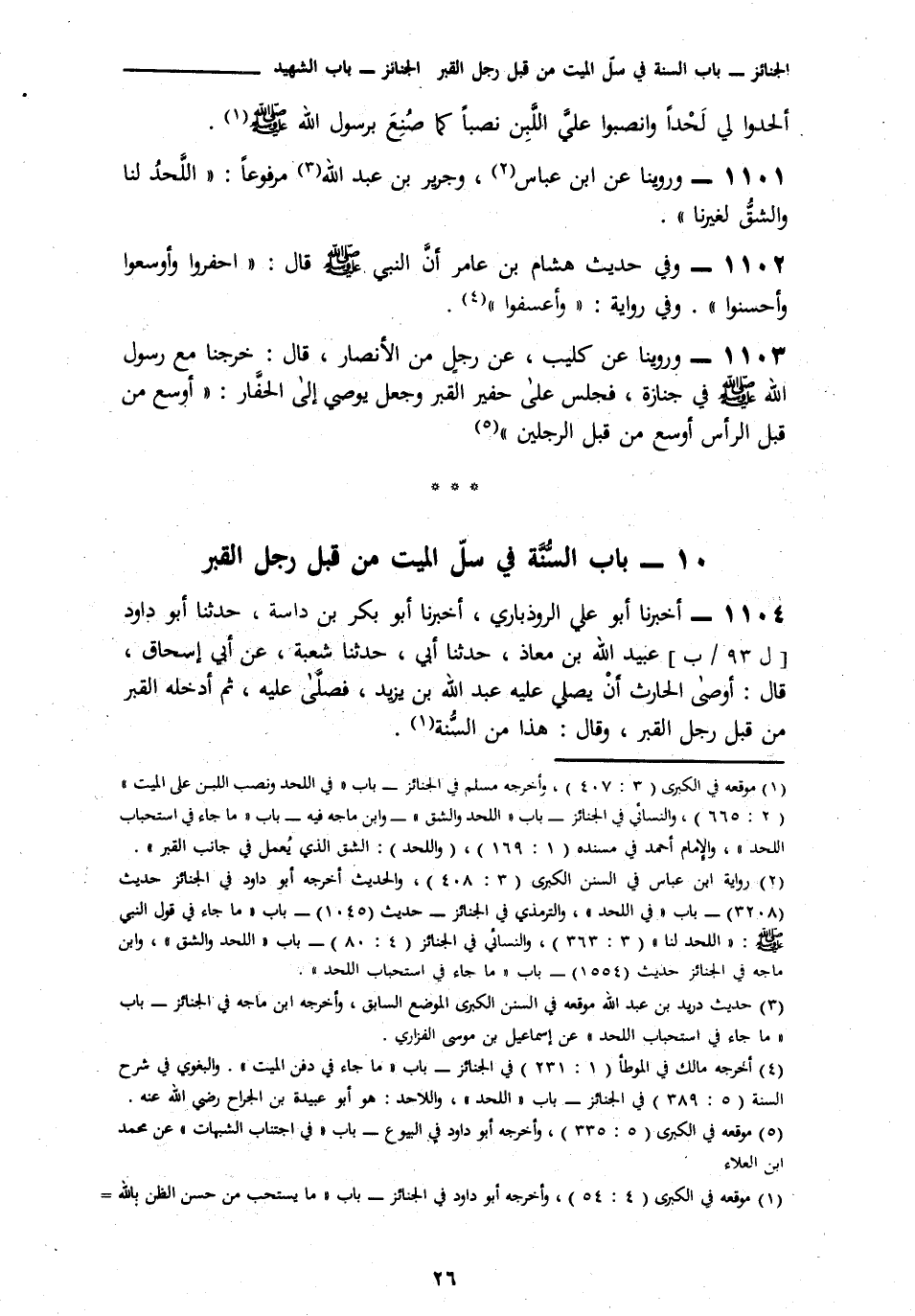 1103 - وَرُوِّينَا عَنْ كُلَيْبٍ، عَنْ رَجُلٍ مِنَ الْأَنْصَارِ قَالَ: خَرَجْنَا مَعَ رَسُولِ اللَّهِ صَلَّى اللهُ عَلَيْهِ وَسَلَّمَ فِي جَنَازَةٍ، فَجَلَسَ عَلَى حَفِيرِ الْقَبْرِ وَجَعَلَ يُومِئُ إِلَى الْحَفَّارِ: «§أَوْسِعْ مِنْ قِبَلِ الرَّأْسِ، أَوْسِعْ مِنْ قِبَلِ الرَّجُلَيْنِ»