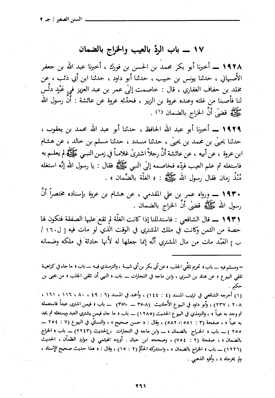 1929 - أَخْبَرَنَا أَبُو عَبْدِ اللَّهِ الْحَافِظُ، ثنَا أَبُو عَبْدِ اللَّهِ مُحَمَّدُ بْنُ يَعْقُوبَ، ثنَا يَحْيَى بْنُ مُحَمَّدِ بْنِ يَحْيَى، ثنَا مُسَدَّدٌ، ثنَا مُسْلِمُ بْنُ خَالِدٍ، عَنْ هِشَامِ بْنِ عُرْوَةَ، عَنْ أَبِيهِ، عَنْ عَائِشَةَ: " أَنَّ رَجُلًا، اشْتَرَى غُلَامًا فِي زَمَنِ النَّبِيِّ صَلَّى اللهُ عَلَيْهِ وَسَلَّمَ وَبِهِ عَيْبٌ لَمْ يُعْلَمْ بِهِ فَاسْتَغَلَّهُ ثُمَّ عَلِمَ الْعَيْبَ فَرَدَّهُ فَخَاصَمَهُ إِلَى النَّبِيِّ صَلَّى اللهُ عَلَيْهِ وَسَلَّمَ فَقَالَ: يَا رَسُولَ اللَّهِ، إِنَّهُ اسْتَغَلَّهُ مُنْذُ زَمَانٍ. فَقَالَ رَسُولُ اللَّهِ صَلَّى اللهُ عَلَيْهِ وَسَلَّمَ: «§الْغَلَّةُ بِالضَّمَانِ»