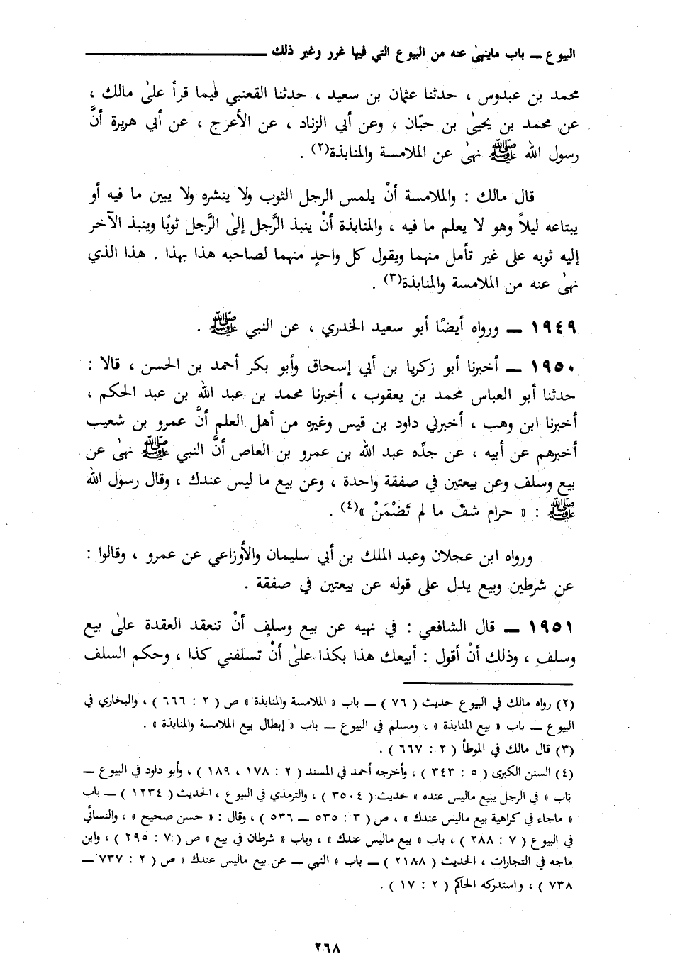 1950 - أَخْبَرَنَا أَبُو زَكَرِيَّا بْنُ أَبِي إِسْحَاقَ، وَأَبُو بَكْرٍ أَحْمَدُ بْنُ الْحَسَنِ، قَالَا: ثنَا أَبُو الْعَبَّاسِ مُحَمَّدُ بْنُ يَعْقُوبَ، أَنَا مُحَمَّدُ بْنُ عَبْدِ اللَّهِ بْنِ عَبْدِ الْحَكَمِ، أَنَا ابْنُ وَهْبٍ، أَخْبَرَنِي دَاوُدُ بْنُ قَيْسٍ، وَغَيْرُهُ مِنْ أَهْلِ الْعِلْمِ أَنَّ عَمْرَو بْنَ شُعَيْبٍ أَخْبَرَهُمْ عَنْ أَبِيهِ، عَنْ جَدِّهِ عَبْدِ اللَّهِ بْنِ عَمْرِو بْنِ الْعَاصِ أَنَّ رَسُولَ اللَّهِ صَلَّى اللهُ عَلَيْهِ وَسَلَّمَ نَهَى عَنْ بَيْعٍ وَسَلَفٍ وَعَنْ بَيْعَتَيْنِ فِي صَفْقَةٍ وَاحِدَةٍ، وَعَنْ بَيْعِ مَا لَيْسَ عِنْدَكَ، وَقَالَ رَسُولُ اللَّهِ صَلَّى اللهُ عَلَيْهِ وَسَلَّمَ: «§حَرَامٌ شِفُّ مَا لَمْ يَضْمَنْ» وَرَوَاهُ ابْنُ عَجْلَانَ، وَعَبْدُ الْمَلِكِ بْنُ أَبِي سُلَيْمَانَ، وَالْأَوْزَاعِيُّ، عَنْ عَمْرٍو، وَقَالُوا: عَنْ شَرطيْنِ وَبَيْعٍ يَدُلُّ عَلَى قَوْلِهِ: عَنْ بَيْعَتَيْنِ فِي صَفْقَةٍ