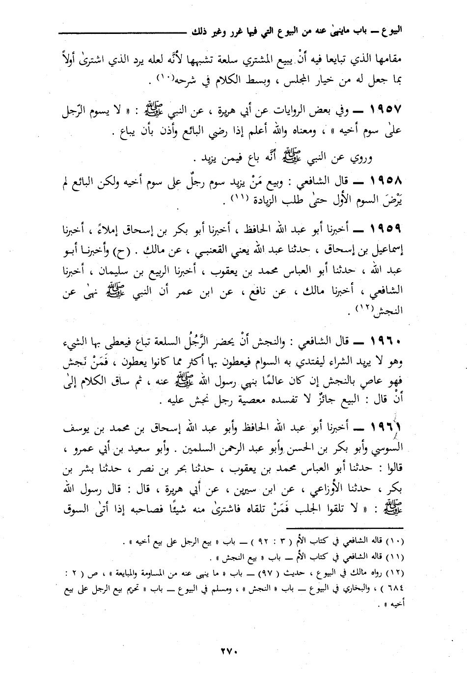 1960 - قَالَ الشَّافِعِيُّ: وَالنَّجَشُ أَنْ يَحْضُرَ الرَّجُلُ السِّلْعَةَ تُبَاعُ فَيُعْطَى بِهَا الشَّيْءَ وَهُوَ لَا يُرِيدُ الشِّرَاءَ لِيَفْتَدِي بِهِ السُّوَّامُ، فَيُعْطَوْنَ بِهَا أَكْثَرَ مِمَّا كَانُوا يُعْطُونَ، فَمَنْ نَجَشَ فَهُوَ عَاصٍ بِالنَّجَشِ إِنْ كَانَ عَالِمًا بِنَهْي رَسُولِ اللَّهِ صَلَّى اللهُ عَلَيْهِ وَسَلَّمَ عَنْهُ، ثُمَّ سَاقَ الْكَلَامَ إِلَى أَنْ قَالَ: الْبَيْعُ جَائِزٌ لَا تُفْسِدُهُ مَعْصِيَةُ رَجُلٍ نَجَشَ عَلَيْهِ