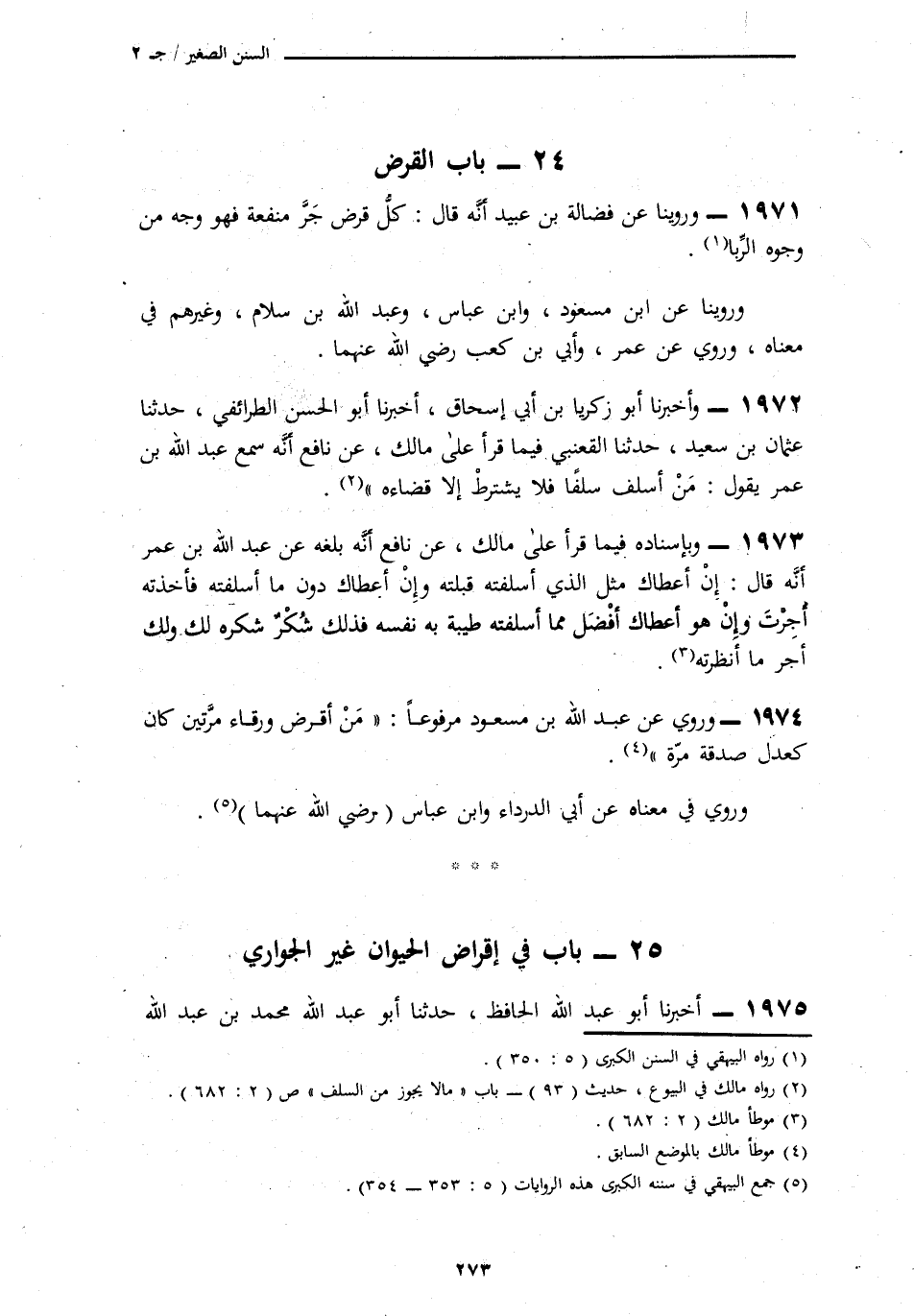 1971 - وَرُوِّينَا عَنْ فَضَالَةَ بْنِ عُبَيْدٍ، أَنَّهُ قَالَ: «كُلُّ قَرْضٍ جَرَّ مَنْفَعَةً فَهُوَ وَجْهٌ مِنْ وُجُوهِ الرِّبَا»، وَرُوِّينَا عَنِ ابْنِ مَسْعُودٍ، وَابْنِ عَبَّاسٍ، وَعَبْدِ اللَّهِ بْنِ سَلَامٍ، وَغَيْرِهِمْ فِي مَعْنَاهُ، وَرُوِيَ عَنْ عُمَرَ، وَأُبَيِّ بْنِ كَعْبٍ، رَضِيَ اللَّهُ عَنْهُمَا
