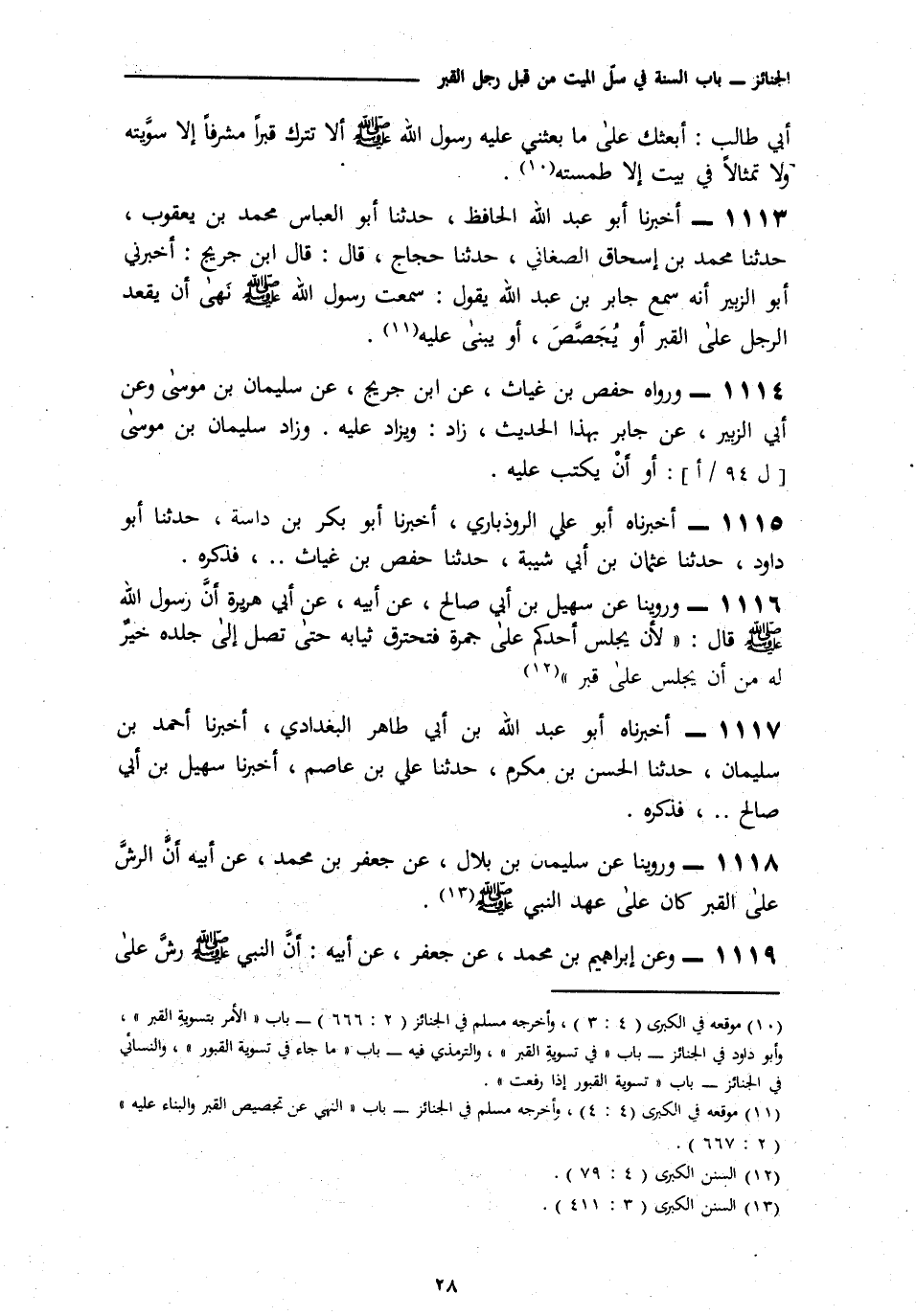1113 - أَخْبَرَنَا أَبُو عَبْدِ اللَّهِ الْحَافِظُ، نَا أَبُو الْعَبَّاسِ مُحَمَّدُ بْنُ يَعْقُوبَ، نَا مُحَمَّدُ بْنُ إِسْحَاقَ الصَّغَانِيُّ، نَا حَجَّاجٌ، قَالَ: قَالَ ابْنُ جُرَيْجٍ: أَخْبَرَنِي أَبُو الزُّبَيْرٍ، أَنَّهُ سَمِعَ جَابِرَ بْنَ عَبْدِ اللَّهِ، يَقُولُ: سَمِعْتُ رَسُولَ اللَّهِ صَلَّى اللهُ عَلَيْهِ وَسَلَّمَ: § «نَهَى أَنْ يَقْعُدَ الرَّجُلُ عَلَى الْقَبْرِ أَوْ يُجَصَّصَ، أَوْ يُبْنَى عَلَيْهِ»