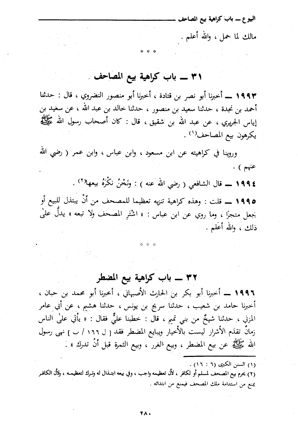 1993 - أَخْبَرَنَا أَبُو نَصْرِ بْنُ قَتَادَةَ، نَا أَبُو مَنْصُورٍ النَّضْرَوِيُّ، قَالَ: ثنَا أَحْمَدُ بْنُ نَجْدَةَ، ثنا سَعِيدُ بْنُ مَنْصُورٍ، ثنَا خَالِدُ بْنُ عَبْدِ اللَّهِ، عَنْ سَعِيدِ بْنِ إِيَاسٍ الْجُرَيْرِيِّ، عَنْ عَبْدِ اللَّهِ بْنِ شَقِيقٍ، قَالَ: «كَانَ §أَصْحَابُ رَسُولِ اللَّهِ صَلَّى اللهُ عَلَيْهِ وَسَلَّمَ يَكْرَهُونَ بَيْعَ الْمَصَاحِفِ»، وَرُوِّينَا فِي كَرَاهِيَتِهِ عَنِ ابْنِ مَسْعُودٍ، وَابْنِ عَبَّاسٍ، وَابْنِ عُمَرَ رَضِيَ اللهُ عَنْهُمْ.