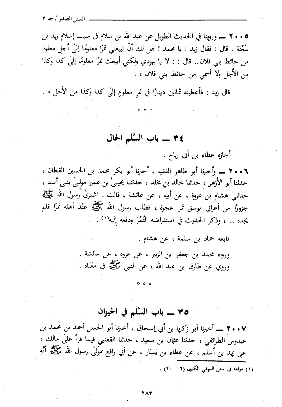 2005 - وَرُوِّينَا فِي الْحَدِيثِ الطَّوِيلِ عَنْ عَبْدِ اللَّهِ بْنِ سَلَامٍ، فِي سَبَبِ إِسْلَامِ زَيْدِ بْنِ سُعْنَةَ قَالَ: فَقَالَ زَيْدٌ: يَا مُحَمَّدُ، هَلْ لَكَ أَنْ تَبِيعَنِيَ تَمْرًا مَعْلُومًا إِلَى أَجَلٍ مَعْلُومٍ مِنْ حَائِطِ بَنِي فُلَانٍ قَالَ: § «لَا يَا يَهُودِيُّ وَلَكِنِّي أَبِيعُكَ تَمْرًا مَعْلُومًا إِلَى كَذَا وَكَذَا مِنَ الْأَجَلِ وَلَا أُسَمِّي مِنْ حَائِطِ بَنِي فُلَانٍ» قَالَ زَيْدٌ: فَأَعْطَيْتُهُ ثَمَانِينَ دِينَارًا فِي تَمْرٍ مَعْلُومٍ إِلَى كَذَا وَكَذَا مِنَ الْأَجَلِ