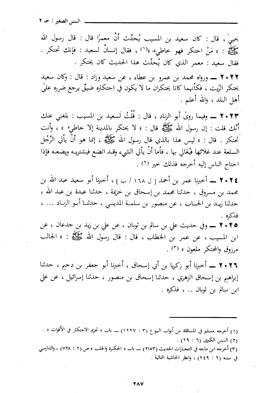 2023 - وَفِيمَا رَوَى أَبُو الزِّنَادِ، قَالَ: قُلْتُ لِسَعِيدِ بْنِ الْمُسَيِّبِ: بَلَغَنِي عَنْكَ أَنَّكَ قُلْتَ: إِنَّ رَسُولَ اللَّهِ صَلَّى اللهُ عَلَيْهِ وَسَلَّمَ قَالَ: § «لَا يَحْتَكِرُ بِالْمَدِينَةَ إِلَّا خَاطِئٌ» وَأَنْتَ تَحْتَكِرُ. قَالَ: لَيْسَ هَذَا بِالَّذِي قَالَ رَسُولُ اللَّهِ صَلَّى اللهُ عَلَيْهِ وَسَلَّمَ، إِنَّمَا هُوَ أَنْ يَأْتِيَ الرَّجُلُ السِّلْعَةَ عِنْدَ غَلَائِهَا فَيُغَالِيَ بِهَا، فَأَمَّا أَنْ يَأْتِيَ الشَّيْءَ وَقَدِ اتَّضَعَ فَيَشْتَرِيَهُ وَيَضَعُهُ فَإِذَا احْتَاجَ النَّاسُ إِلَيْهِ أَخْرَجَهُ فَذَلِكَ خَيْرٌ.
