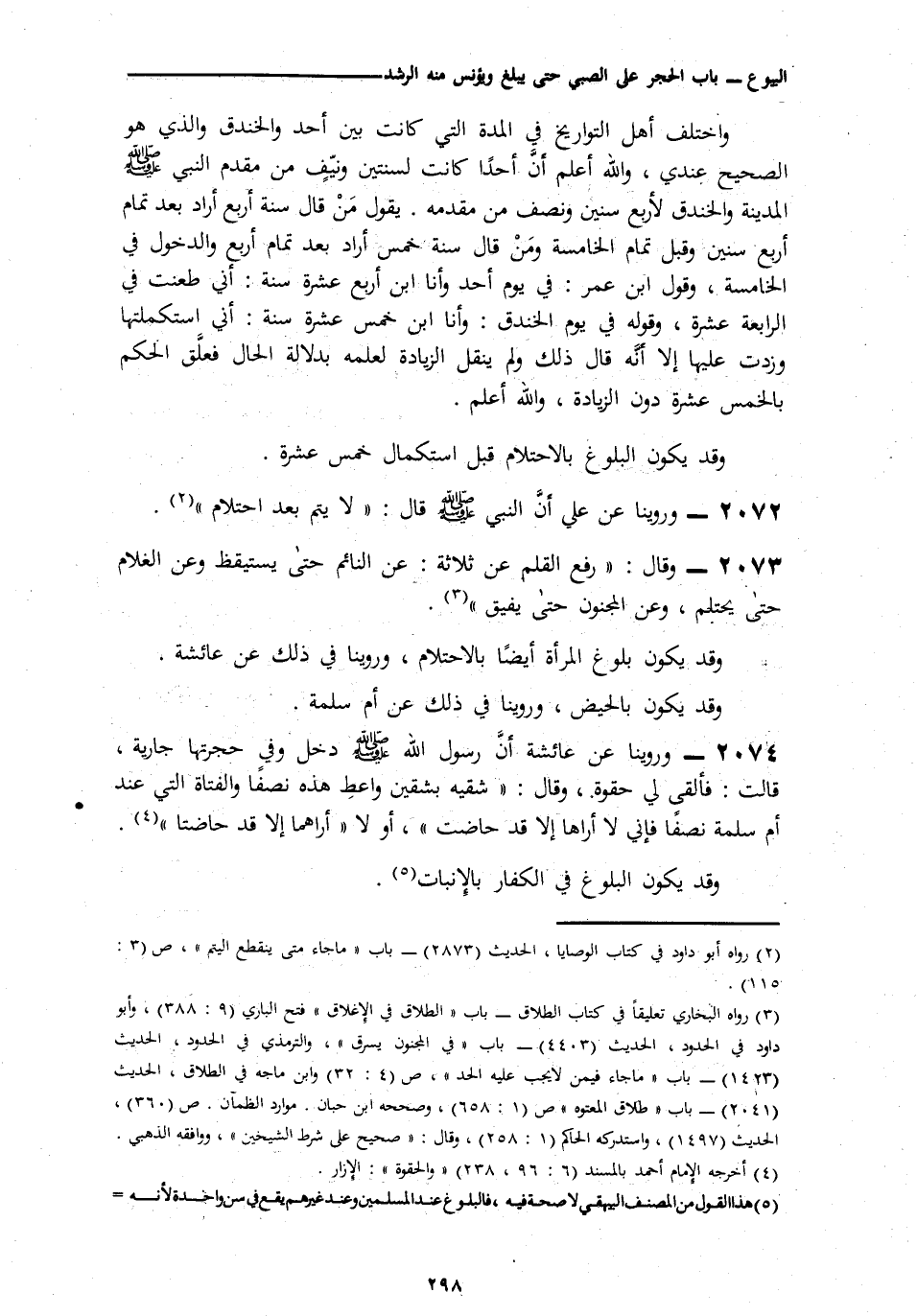 2073 - وَقَالَ: «رُفِعَ الْقَلَمُ عَنْ ثَلَاثَةٍ عَنِ النَّائِمِ حَتَّى يَسْتَيْقِظَ وَعَنِ الْغُلَامِ حَتَّى يَحْتَلِمَ، وَعَنِ الْمَجْنُونِ حَتَّى يُفِيقَ»، وَقَدْ يَكُونُ بُلُوغُ الْمَرْأَةِ أَيْضًا بِالِاحْتِلَامِ، وَرُوِّينَا فِي ذَلِكَ عَنْ عَائِشَةَ وَقَدْ يَكُونُ بِالْحَيْضِ، وَرُوِّينَا فِي ذَلِكَ عَنْ أُمِّ سَلَمَةَ