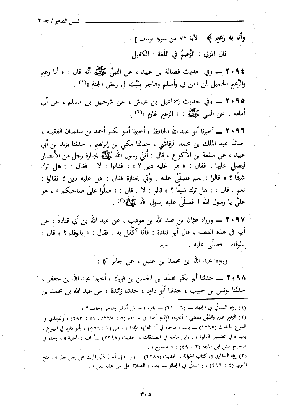 2094 - وَفِي حَدِيثِ فُضَالَةَ بْنِ عُبَيْدٍ، عَنِ النَّبِيِّ صَلَّى اللهُ عَلَيْهِ وَسَلَّمَ أَنَّهُ قَالَ: «§أَنَا زَعِيمٌ، وَالزَّعِيمُ الْحَمِيلُ، لِمَنْ آمَنَ بِي وَأَسْلَمَ وَهَاجَرَ بِبَيْتٍ فِي رَبَضِ الْجَنَّةِ»