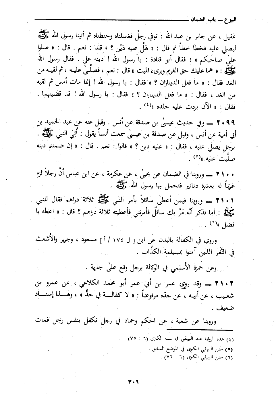 2101 - وَرُوِّينَا فِيمَنْ أَعْطَى سَائِلًا بِأَمْرِ النَّبِيِّ صَلَّى اللهُ عَلَيْهِ وَسَلَّمَ ثَلَاثَةَ دَرَاهِمَ فَقَالَ لِلنَّبِيِّ صَلَّى اللهُ عَلَيْهِ وَسَلَّمَ: أَمَا تَذْكُرُ أَنَّهُ مَرَّ بِكَ سَائِلٌ فَأَمَرَتْنِي فَأَعْطَيْتُهُ ثَلَاثَةَ دَرَاهِمَ؟ قَالَ: § «أَعْطِهِ يَا فَضْلُ» وَرُوِيَ فِي الْكَفَالَةِ بِالْبُدْنِ عَنِ ابْنِ مَسْعُودٍ، وَجَرِيرٍ، وَالْأَشْعَثَ، فِي النَّفَرِ الَّذِينَ آمَنُوا بِمُسَيْلِمَةَ الْكَذَّابِ وَعَنْ حَمْزَةَ الْأَسْلَمِيِّ، فِي الْوَكَالَةِ بِرَجُلٍ وَقَعَ عَلَى جَارِيَةٍ