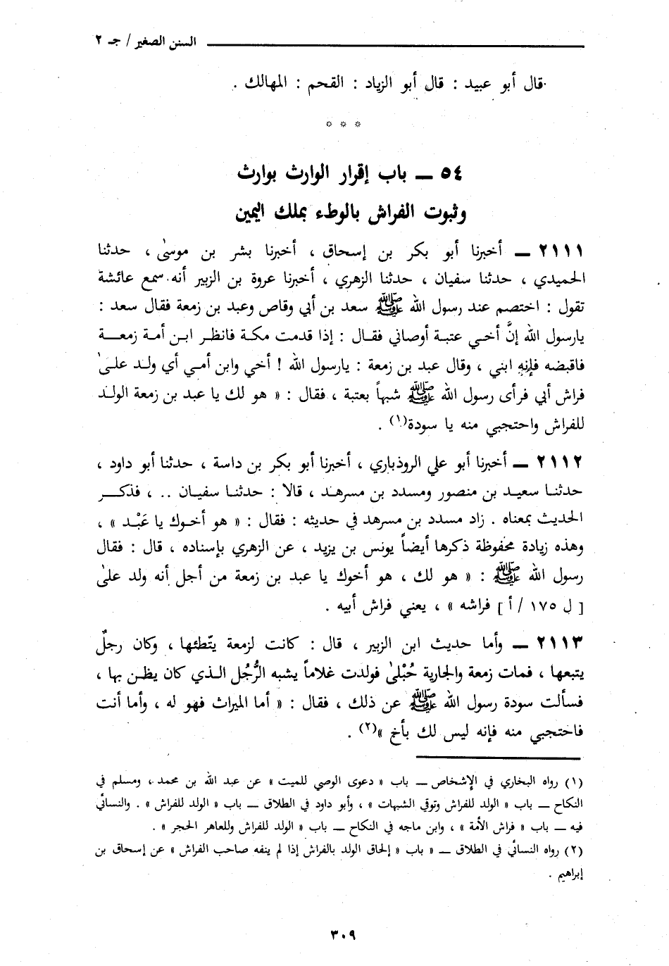 2111 - أَخْبَرَنَا أَبُو عَبْدِ اللهِ الْحَافِظُ، أنا أَبُو بَكْرِ بْنُ إِسْحَاقَ، نا بِشْرُ بْنُ مُوسَى، ثنا الْحُمَيْدِيُّ، ثنا سُفْيَانُ، ثنا الزُّهْرِيُّ، نا عُرْوَةُ بْنُ الزُّبَيْرِ، أَنَّهُ سَمِعَ عَائِشَةَ، تَقُولُ: اخْتَصَمَ عِنْدَ رَسُولِ اللَّهِ صَلَّى اللهُ عَلَيْهِ وَسَلَّمَ سَعْدُ بْنُ أَبِي وَقَّاصٍ وَعَبْدُ بْنُ زَمْعَةَ فَقَالَ سَعْدٌ: يَا رَسُولَ اللَّهِ إِنَّ أَخِي عُتْبَةَ أَوْصَانِي فَقَالَ: إِذَا قَدِمْتَ مَكَّةَ فَانْظُرِ ابْنَ أَمَةِ زَمْعَةَ فَاقْبِضْهُ فَإِنَّهُ ابْنِي. وَقَالَ عَبْدُ بْنُ زَمْعَةَ: يَا رَسُولَ اللَّهِ، أَخِي وَابْنُ أَمَةِ أَبِي وُلِدَ عَلَى فِرَاشِ أَبِي. فَرَأَى رَسُولُ اللَّهِ صَلَّى اللهُ عَلَيْهِ وَسَلَّمَ شَبَهًا بِعُتْبَةَ فَقَالَ: § «هُوَ لَكَ يَا عَبْدُ بْنَ زَمْعَةَ الْوَلَدُ لِلْفِرَاشِ وَاحْتَجِبِي مِنْهُ يَا سَوْدَةُ»،