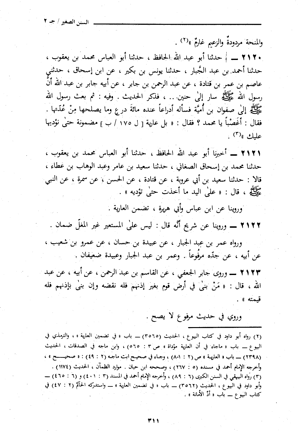 2121 - أَخْبَرَنَا أَبُو عَبْدِ اللَّهِ الْحَافِظُ، ثنا أَبُو الْعَبَّاسِ مُحَمَّدُ بْنُ يَعْقُوبَ، ثنا مُحَمَّدُ بْنُ إِسْحَاقَ الصَّغَانِيُّ، ثنا سَعِيدُ بْنُ عَامِرٍ، وَعَبْدُ الْوَهَّابِ بْنِ عَطَاءٍ، قَالَا: ثنا سَعِيدُ بْنُ أَبِي عَرُوبَةَ، عَنْ قَتَادَةَ، عَنِ الْحَسَنِ، عَنْ سَمُرَةَ عَنِ النَّبِيِّ صَلَّى اللهُ عَلَيْهِ وَسَلَّمَ قَالَ: «§عَلَى الْيَدِ مَا أَخَذَتْ حَتَّى تُؤَدِّيَهُ»، وَرُوِّينَا عَنِ ابْنِ عَبَّاسٍ، وَأَبِي هُرَيْرَةَ تَضْمِينَ الْعَارِيَةِ