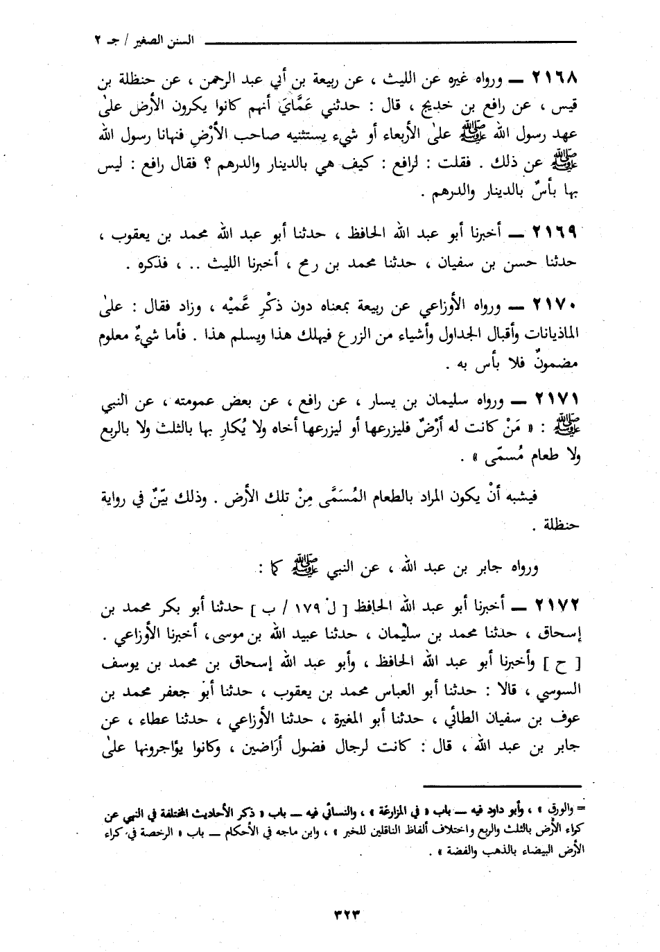 2172 - أَخْبَرَنَا أَبُو عَبْدِ اللَّهِ الْحَافِظُ، ثنا أَبُو بَكْرٍ مُحَمَّدُ بْنُ إِسْحَاقَ، ثنا مُحَمَّدُ بْنُ سُلَيْمَانَ، ثنا عُبَيْدُ اللَّهِ بْنُ مُوسَى، أَنَا الْأَوْزَاعِيُّ، ح وَأَخْبَرَنَا أَبُو عَبْدِ اللَّهِ إِسْحَاقُ بْنُ مُحَمَّدِ بْنِ يُوسُفَ السُّوسِيُّ، قَالَا: ثنا أَبُو الْعَبَّاسِ مُحَمَّدُ بْنُ يَعْقُوبَ، ثنا أَبُو جَعْفَرٍ مُحَمَّدُ بْنُ عَوْفِ بْنِ سُفْيَانَ الطَّائِيُّ، ثنا أَبُو الْمُغِيرَةِ، ثنا الْأَوْزَاعِيُّ، ثنا عَطَاءٌ، عَنْ جَابِرِ بْنِ عَبْدِ اللَّهِ، قَالَ: كَانَتْ لِرِجَالٍ فُضُولُ أَرَاضِينَ، وَكَانُوا يُؤَاجِرُونَهَا عَلَى -[324]- الثُّلُثِ وَالرُّبُعِ وَالنِّصْفِ، فَقَالَ رَسُولُ اللَّهِ صَلَّى اللهُ عَلَيْهِ وَسَلَّمَ: «§مَنْ كَانَتْ لَهُ فَضْلُ أَرْضٍ، فَلْيَزْرَعْهَا أَوْ لِيَمْنَحْهَا أَخَاهُ، فَإِنْ أَبَى فَلْيُمْسِكْ أَرْضَهُ» وَذَهَبَ جَمَاعَةٌ إِلَى جَوَازِ اسْتِكْرَائِهَا بِثُلُثِ مَا يَخْرُجُ مِنْهَا، وَالرُّبُعُ، وَجُزْءٌ مَعْلُومٌ مُشَاعٌ، وَاحْتَجُّوا بِحَدِيثِ ابْنِ عُمَرَ وَغَيْرِهِ فِي مُعَامَلَةِ صَلَّى اللهُ عَلَيْهِ وَسَلَّمَ أَهْلَ خَيْبَرَ عَلَى شَطْرِ مَا يَخْرُجُ مِنْهَا مِنْ ثَمَرٍ وَزَرْعٍ وَأَنَّ النَّهْيَ فِي حَدِيثِ رَافِعٍ وَغَيْرِهِ لِمَا كَانُوا يُلْحِقُونَ بِهِ مِنَ الشُّرُوطِ الْفَاسِدَةِ. وَاسْتَعْمَلَ الشَّافِعِيُّ رَضِيَ اللَّهُ عَنْهُ الْأَحَادِيثَ كُلَّهَا فَلَمْ يُجَوِّزِ الْمُزَارَعَةَ بِبَعْضِ مَا يَخْرُجُ مِنْهَا إِذَا كَانَتْ مُنْفَرِدَةً، فَإِذَا كَانَتْ بَيْنَ ظَهْرَانَيِ النَّخْلِ أَجَازَهَا، وَقَالَ: أَجَزْنَا مَا أَجَازَ النَّبِيُّ صَلَّى اللهُ عَلَيْهِ وَسَلَّمَ وَرَدَدْنَا مَا رَدَّ، وَفَرَّقْنَا بِفَرْقِهِ صَلَّى اللهُ عَلَيْهِ وَسَلَّمَ بَيْنَهُمَا، وَبِاللَّهِ التَّوْفِيقُ