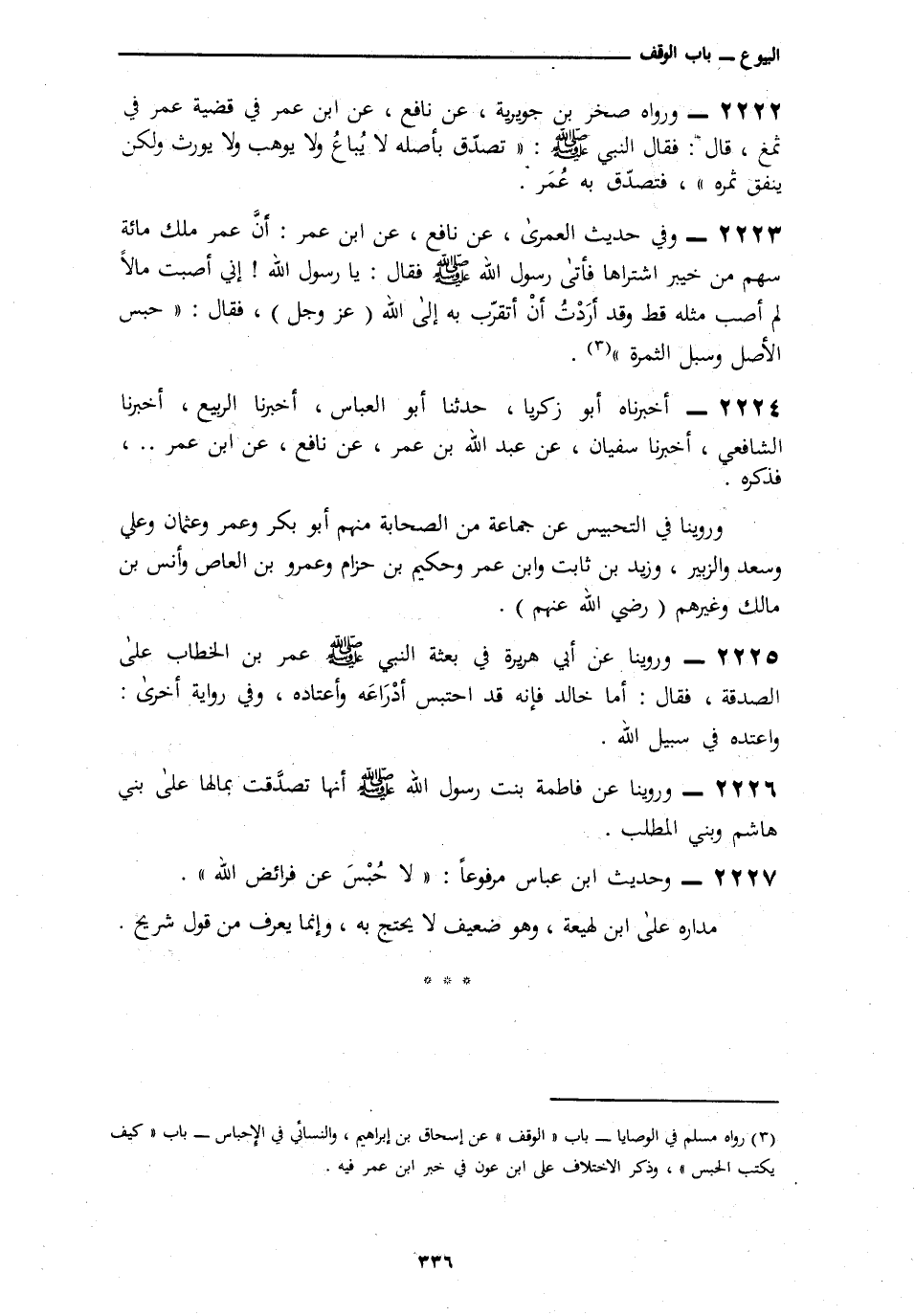 2222 - وَرَوَاهُ صَخْرُ بْنُ جُوَيْرِيَةَ، عَنْ نَافِعٍ، عَنِ ابْنِ عُمَرَ فِي قَضِيَّةِ عُمَرَ فِي ثَمْغٍ قَالَ: فَقَالَ النَّبِيُّ صَلَّى اللهُ عَلَيْهِ وَسَلَّمَ: § «تَصَدَّقْ بِأَصْلِهِ لَا يُبَاعُ وَلَا يُوهَبُ وَلَا يُورَثُ وَلَكِنْ يُنْفَقُ ثَمَرُهُ» فَتَصَدَّقَ بِهِ عُمَرُ.