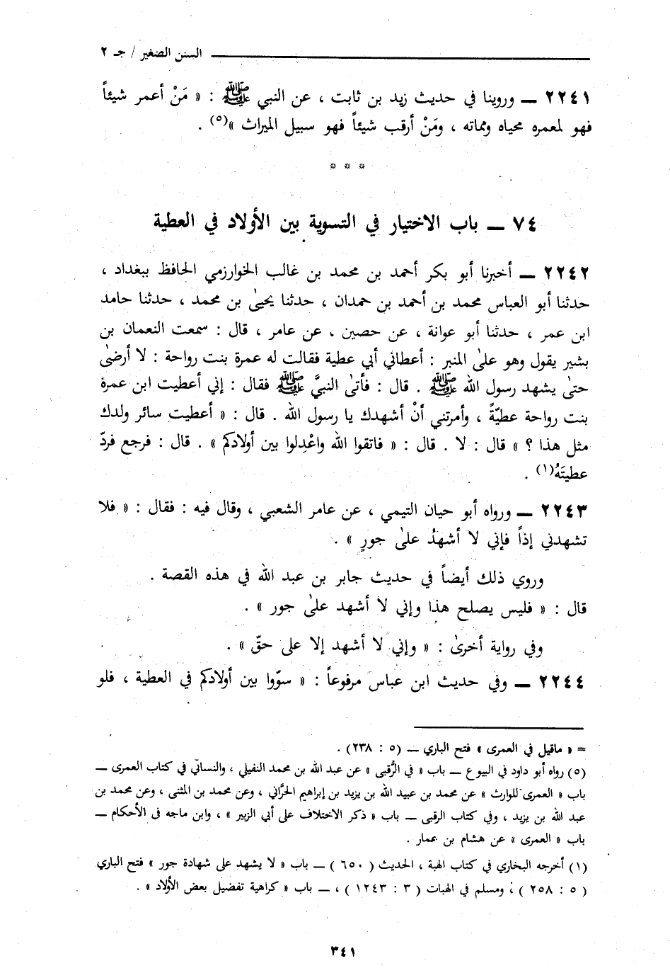 2242 - أَخْبَرَنَا أَبُو بَكْرٍ أَحْمَدُ بْنُ مُحَمَّدِ بْنِ غَالِبٍ الْخُوَارِزْمِيُّ الْحَافِظُ بِبَغْدَادَ، ثنا أَبُو الْعَبَّاسِ مُحَمَّدُ بْنُ أَحْمَدَ بْنِ حَمْدَانَ، ثنا تَمِيمُ بْنُ مُحَمَّدٍ، ثنا حَامِدُ بْنُ عُمَرَ، ثنا أَبُو عَوَانَةَ، عَنْ حُصَيْنٍ، عَنْ عَامِرٍ، قَالَ: سَمِعْتُ النُّعْمَانَ بْنَ بَشِيرٍ، يَقُولُ وَهُوَ عَلَى الْمِنْبَرِ: أَعْطَانِي أَبِي عَطِيَّةً فَقَالَتْ لَهُ عَمْرَةُ بِنْتُ رَوَاحَةَ: لَا أَرْضَى حَتَّى يَشْهَدَ رَسُولُ اللَّهِ صَلَّى اللهُ عَلَيْهِ وَسَلَّمَ. قَالَ: فَأَتَى النَّبِيَّ صَلَّى اللهُ عَلَيْهِ وَسَلَّمَ فَقَالَ: إِنِّي أَعْطَيْتُ ابْنَ عَمْرَةَ بِنْتِ رَوَاحَةَ عَطِيَّةً، وَأَمَرَتْنِي أَنْ أُشْهِدَكَ يَا رَسُولَ اللَّهِ. قَالَ: «§أَعْطَيْتَ سَائِرَ وَلَدِكَ مِثْلَ هَذَا؟» قَالَ: لَا. قَالَ: «فَاتَّقُوا اللَّهَ وَاعْدِلُوا بَيْنَ أَوْلَادِكُمْ» قَالَ: فَرَجَعَ فَرَدَّ عَطِيَّتَهُ