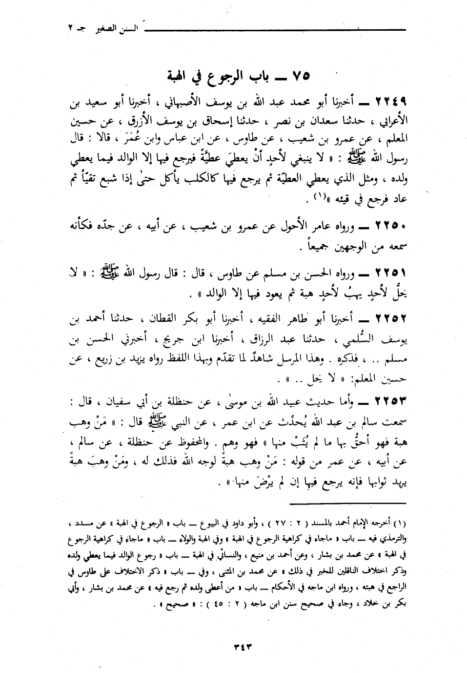2249 - أَخْبَرَنَا أَبُو مُحَمَّدِ عَبْدُ اللَّهِ بْنُ يُوسُفَ الْأَصْبَهَانِيُّ، نا أَبُو سَعِيدِ بْنُ الْأَعْرَابِيِّ، ثنا سَعْدَانُ بْنُ نَصْرٍ، ثنا إِسْحَاقُ بْنُ يُوسُفَ الْأَزْرَقُ، عَنْ حُسَيْنٍ الْمُعَلِّمِ، عَنْ عَمْرِو بْنِ شُعَيْبٍ، عَنْ طَاوُسٍ، عَنِ ابْنِ عَبَّاسٍ، وَابْنِ عُمَرَ، قَالَا: قَالَ رَسُولُ اللَّهِ صَلَّى اللهُ عَلَيْهِ وَسَلَّمَ: § «لَا يَنْبَغِي لِأَحَدٍ أَنْ يُعْطِيَ عَطِيَّةُ فَيَرْجِعَ فِيهَا إِلَّا الْوَالِدُ فِيمَا يُعْطِي وَلَدَهُ، وَمَثَلُ الَّذِي يُعْطِي الْعَطِيَّةَ ثُمَّ يَرْجِعُ فِيهَا كَالْكَلْبِ يَأْكُلُ حَتَّى إِذَا شَبِعَ تَقَيَّأَ، ثُمَّ عَادَ فَرَجَعَ فِي قَيْئِهِ»،