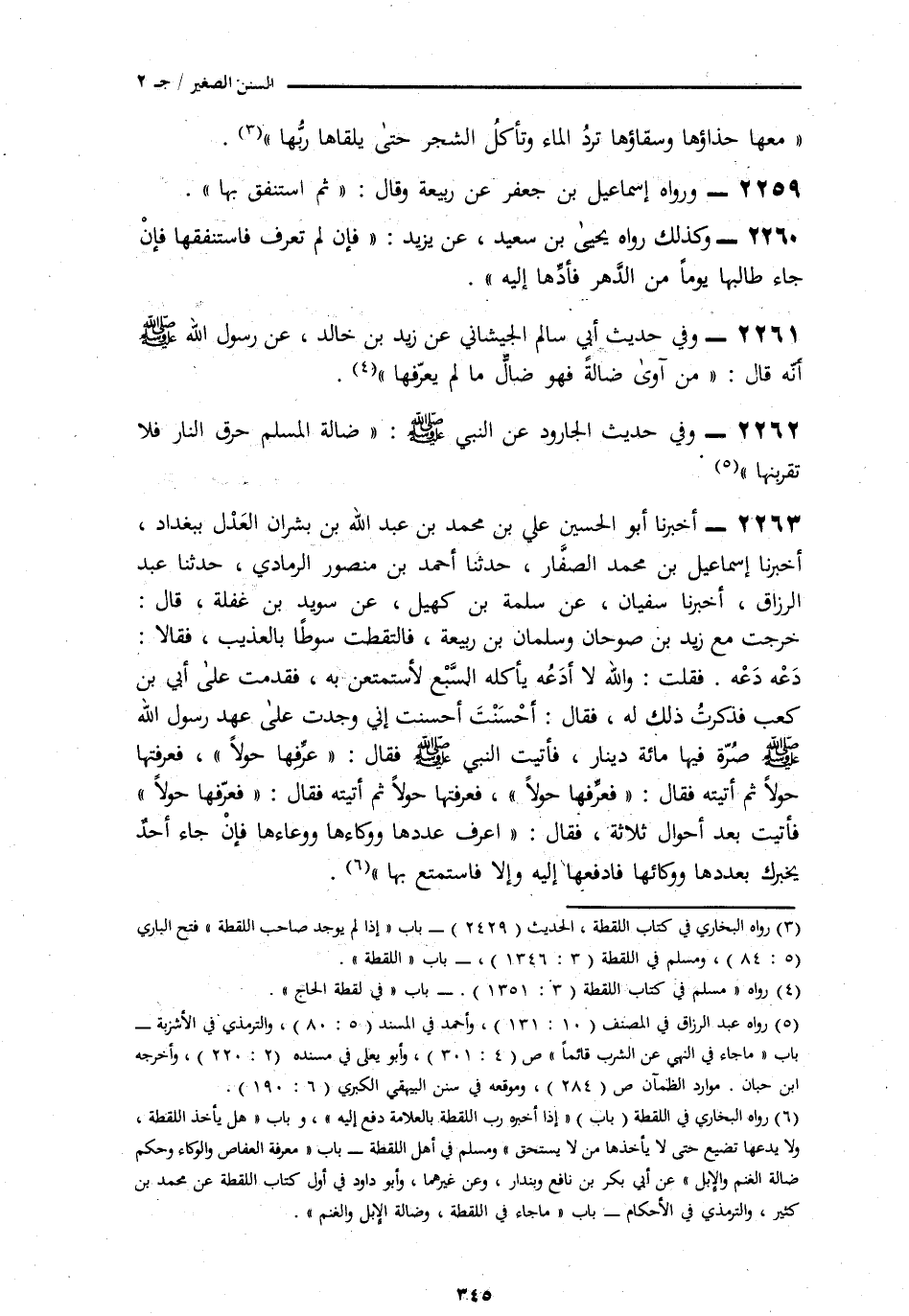 2263 - أَخْبَرَنَا أَبُو الْحُسَيْنِ عَلِيُّ بْنُ مُحَمَّدِ بْنِ عَبْدِ اللَّهِ بْنِ بِشْرَانَ الْعَدْلُ بِبَغْدَادَ، نا إِسْمَاعِيلُ بْنُ مُحَمَّدٍ الصَّفَّارُ، ثنا أَحْمَدُ بْنُ مَنْصُورٍ الرَّمَادِيُّ، ثنا عَبْدُ الرَّزَّاقِ، نا سُفْيَانُ، عَنْ سَلَمَةَ بْنِ كُهَيْلٍ، عَنْ سُوَيْدِ بْنِ غَفَلَةَ، قَالَ: خَرَجْتُ مَعَ زَيْدِ بْنِ صُوحَانَ وَسَلْمَانَ بْنِ رَبِيعَةَ، فَالْتَقَطْتُ سَوْطًا بِالْعُذَيْبِ، فَقَالَا: دَعْهُ دَعْهُ. فَقُلْتُ: وَاللَّهِ لَا أَدَعُهُ يَأْكُلُهُ السَّبُعُ لَأَسْتَمْتِعَنَّ بِهِ، فَقَدِمْتُ عَلَى أُبَيِّ بْنِ كَعْبٍ فَذَكَرْتُ ذَلِكَ لَهُ، فَقَالَ: أَحْسَنْتَ أَحْسَنْتَ إِنِّي وَجَدْتُ عَلَى عَهْدِ رَسُولِ اللَّهِ صَلَّى اللهُ عَلَيْهِ وَسَلَّمَ صُرَّةً فِيهَا مِائَةُ دِينَارٍ، فَأَتَيْتُ النَّبِيَّ صَلَّى اللهُ عَلَيْهِ وَسَلَّمَ فَقَالَ: «§عَرِّفْهَا حَوْلًا»، فَعَرَّفْتُهَا حَوْلًا ثُمَّ أَتَيْتُهُ فَقَالَ: «فَعَرِّفْهَا حَوْلًا» فَعَرَّفْتُهَا حَوْلًا ثُمَّ أَتَيْتُهُ فَقَالَ: «فَعَرِّفْهَا حَوْلًا» فَأَتَيْتُ بَعْدَ أَحْوَالٍ ثَلَاثَةٍ، فَقَالَ: «اعْرَفْ عَدَدَهَا وَوِكَاءَهَا وَوِعَاءَهَا فَإِنْ جَاءَ أَحَدٌ يُخْبِرُكَ بِعَدَدِهَا وَوِكَائِهَا فَادْفَعْهَا إِلَيْهِ وَإِلَّا فَاسْتَمْتِعْ بِهَا» -[346]- كَذَا فِي رِوَايَةِ سَلَمَةَ بْنِ كُهَيْلٍ بَعْدَ ثَلَاثَةِ أَحْوَالٍ، ثُمَّ لَقِيَهُ شُعْبَةُ بِمَكَّةَ فَقَالَ: لَا أَدْرِي ثَلَاثَةَ أَحْوَالٍ أَوْ حَوْلًا وَاحِدًا. وَرُوِيَ عَنْ شُعْبَةَ أَنَّهُ، قَالَ: سَمِعْتُ سَلَمَةَ بَعْدَ عَشْرِ سِنِينَ يَقُولُ: «عَرِّفْهَا عَامًا وَاحِدًا» فَكَأَنَّهُ كَانَ يَشُكُّ فِيهِ ثُمَّ تَذَكَّرَهُ