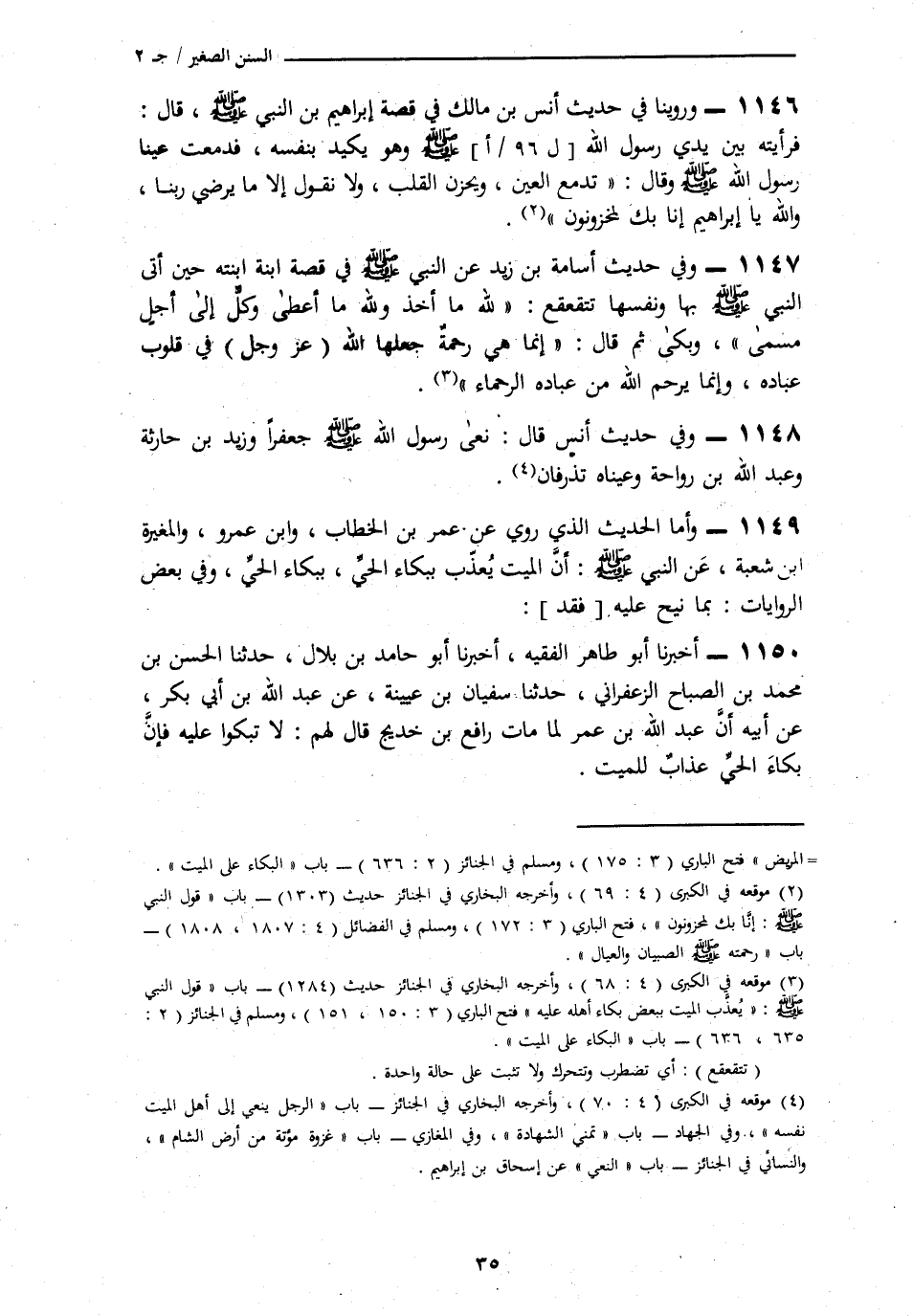 1146 - وَرُوِّينَا فِي، حَدِيثِ أَنَسِ بْنِ مَالِكٍ، فِي قِصَّةِ إِبْرَاهِيمَ ابْنِ النَّبِيِّ صَلَّى اللهُ عَلَيْهِ وَسَلَّمَ، قَالَ: فَرَأَيْتُهُ بَيْنَ يَدَيْ رَسُولِ اللَّهِ صَلَّى اللهُ عَلَيْهِ وَسَلَّمَ، وَهُوَ يَكِيدُ بِنَفْسِهِ، فَدَمَعَتْ عَيْنَا رَسُولِ اللَّهِ صَلَّى اللهُ عَلَيْهِ وَسَلَّمَ وَقَالَ: «§تَدْمَعُ الْعَيْنُ، وَيَحْزَنُ الْقَلْبُ، وَلَا نَقُولُ إِلَّا مَا يُرْضِي رَبَّنَا، وَاللَّهِ يَا إِبْرَاهِيمُ إِنَّا بِكَ لَمَحْزُونُونَ»