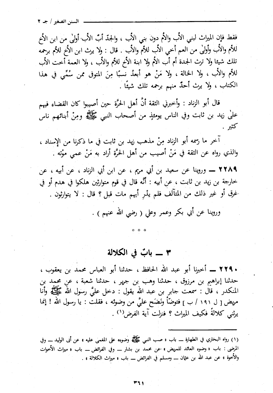2290 - أَخْبَرَنَا أَبُو عَبْدِ اللَّهِ الْحَافِظُ، ثنا أَبُو الْعَبَّاسِ مُحَمَّدُ بْنُ يَعْقُوبَ، ثنا إِبْرَاهِيمُ بْنُ مَرْزُوقٍ، ثنا وَهْبُ بْنُ جَرِيرٍ، ثنا شُعْبَةُ، عَنْ مُحَمَّدِ بْنِ الْمُنْكَدِرِ، قَالَ: سَمِعْتُ جَابِرَ بْنَ عَبْدِ اللَّهِ يَقُولُ: §دَخَلَ عَلَيَّ رَسُولُ اللَّهِ صَلَّى اللهُ عَلَيْهِ وَسَلَّمَ وَأَنَا مَرِيضٌ فَتَوَضَّأَ وَنَضَحَ عَلَيَّ مِنْ وَضُوئِهِ، فَقُلْتُ: يَا رَسُولَ اللَّهِ إِنَّمَا يَرِثُنِي كَلَالَةً فَكَيْفَ الْمِيرَاثُ؟ فَنَزَلَتْ آيَةُ الْفَرْضِ -[362]-، وَأَرَادَ بِآيَةِ الْفَرْضِ: {«يَسْتَفْتُونَكَ قُلِ اللَّهُ يُفْتِيكُمْ فِي الْكَلَالَةِ»} [النساء: 176] وَذَلِكَ بَيِّنٌ فِي رِوَايَةِ ابْنِ عُيَيْنَةَ، عَنِ ابن الْمُنْكَدِرِ، عَنْ جَابِرٍ، وَفِي رِوَايَةِ هِشَامٍ الدَّسْتُوَائِيِّ، عَنْ أَبِي الزُّبَيْرِ، عَنْ جَابِرٍ، وَفِي حَدِيثِهِمْ أَنَّهُ قَالَ: «وَلِي أَخَوَاتٌ» وَجَابِرُ بْنُ عَبْدِ اللَّهِ قُتِلَ أَبُوهُ يَوْمَ أُحُدٍ وَآيَةُ الْكَلَالَةِ نَزَلَتْ بَعْدَهُ، فَقَدْ قَالَ الْبَرَاءُ بْنُ عَازِبٍ: آخِرُ آيَةٍ نَزَلَتْ: {«يَسْتَفْتُونَكَ قُلِ اللَّهُ يُفْتِيكُمْ فِي الْكَلَالَةِ»} [النساء: 176] فَحِينَ مَرِضَ جَابِرٌ لَمْ يَكُنْ لَهُ وَلَدٌ وَلَا وَالِدٌ وَإِنَّمَا كَانَتْ لَهُ أَخَوَاتٌ، فَأَنْزَلَ اللَّهُ تَعَالَى فِي أَخَوَاتِهِ آيَةَ الْكَلَالَةِ الَّتِي فِي آخِرِ سُورَةِ النِّسَاءِ، فَلِذَلِكَ قُلْنَا: «الْكَلَالَةُ مَنْ لَا وَلَدَ لَهُ وَلَا وَالِدٌ»