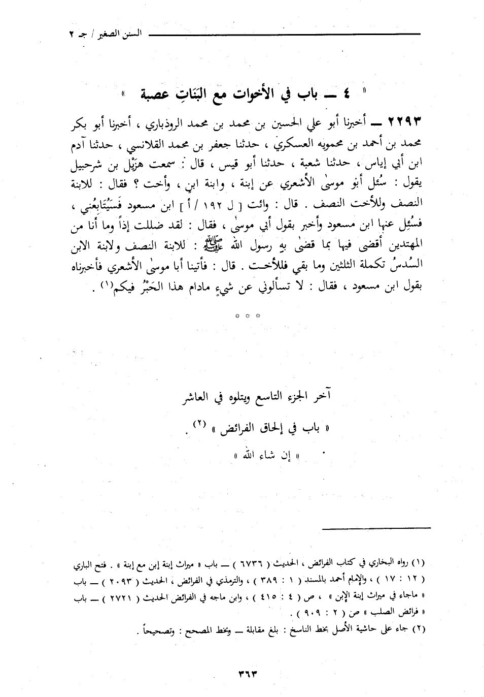 2293 - أَخْبَرَنَا أَبُو عَلِيٍّ الْحُسَيْنُ بْنُ مُحَمَّدِ بْنِ مُحَمَّدٍ الرُّوذْبَارِيُّ، نا أَبُو بَكْرٍ مُحَمَّدُ بْنُ أَحْمَدَ بْنِ مَحْمَوَيْهِ الْعَسْكَرِيُّ، ثنا جَعْفَرُ بْنُ مُحَمَّدٍ الْقَلَانِسِيُّ، ثنا آدَمُ بْنُ أَبِي إِيَاسَ، ثنا شُعْبَةُ، ثنا أَبُو قَيْسٍ، قَالَ: سَمِعْتُ هُزَيْلَ بْنَ شُرَحْبِيلَ، يَقُولُ: سُئِلَ أَبُو مُوسَى الْأَشْعَرِيُّ عَنِ ابْنَةٍ، وَابْنَةِ ابْنٍ وَأُخْتٍ؟ فَقَالَ: «§لِلِابْنَةِ النِّصْفُ، وَلِلْأُخْتِ النِّصْفُ» قَالَ: وَائْتِ ابْنَ مَسْعُودٍ فَسَيُتَابِعُنِي، فَسُئِلَ عَنْهَا ابْنُ مَسْعُودٍ، وَأُخْبِرَ بِقَوْلِ أَبِي مُوسَى قَالَ: لَقَدْ ضَلَلْتُ إِذًا وَمَا أَنَا مِنَ الْمُهْتَدِينَ أَقْضِي فِيهَا بِمَا قَضَى رَسُولُ اللَّهِ صَلَّى اللهُ عَلَيْهِ وَسَلَّمَ: «لِلِابْنَةِ النِّصْفُ، وَلِابْنَةِ الِابْنِ السُّدُسُ تَكْمِلَةً لِلثُّلُثَيْنِ، وَمَا بَقِيَ فَلِلْأُخْتِ» قَالَ: فَأَتَيْنَا أَبَا مُوسَى الْأَشْعَرِيَّ فَأَخْبَرَنَاهُ بِقَوْلِ ابْنِ مَسْعُودٍ، فَقَالَ: «لَا تَسْأَلُونِي عَنْ شَيْءٍ مَا دَامَ هَذَا الْحَبْرُ فِيكُمْ»