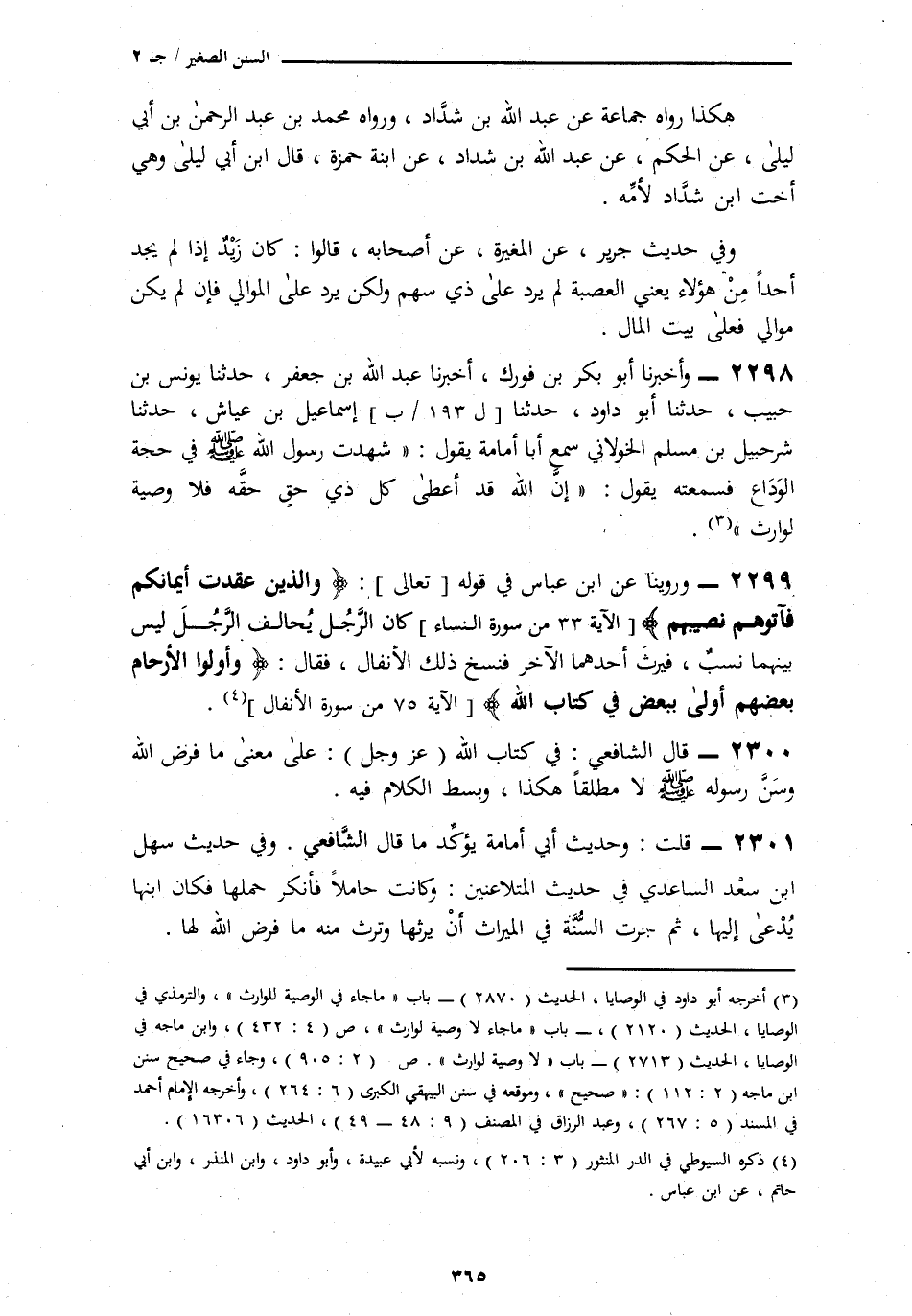 2299 - وَرُوِّينَا عَنِ ابْنِ عَبَّاسٍ، فِي قَوْلِهِ تَعَالَى {«§وَالَّذِينَ عَقَدَتْ أَيْمَانُكُمْ فَآتُوهُمْ نَصِيبَهُمْ»} [النساء: 33] كَانَ الرَّجُلُ يُحَالِفُ الرَّجُلَ لَيْسَ بَيْنَهُمَا نَسَبٌ، فَيَرِثُ أَحَدُهُمَا الْآخَرَ فَنَسَخَ ذَلِكَ الْأَنْفَالُ فَقَالَ: {«وَأُولُو الْأَرْحَامِ بَعْضُهُمْ أَوْلَى بِبَعْضٍ فِي كِتَابِ اللَّهِ»} [الأحزاب: 6]