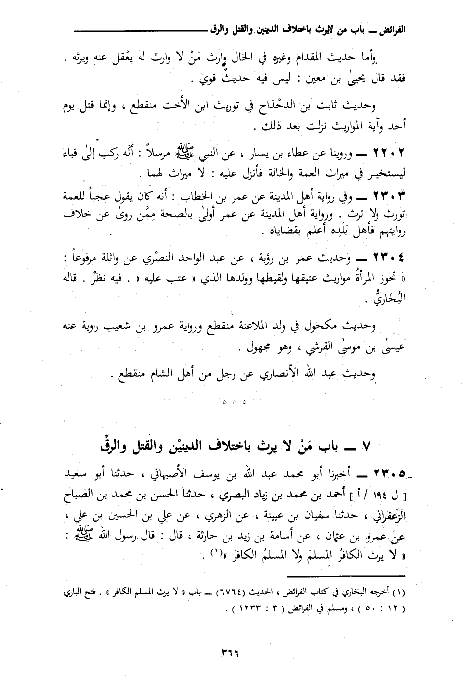 2305 - أَخْبَرَنَا أَبُو مُحَمَّدٍ عَبْدُ اللَّهِ بْنُ يُوسُفَ الْأَصْبَهَانِيُّ، ثنا أَبُو سَعِيدٍ أَحْمَدُ بْنُ مُحَمَّدِ بْنِ زِيَادٍ الْبَصْرِيُّ، ثنا الْحَسَنُ بْنُ مُحَمَّدِ بْنِ الصَّبَّاحِ الزَّعْفَرَانِيُّ، ثنا سُفْيَانُ بْنُ عُيَيْنَةَ، عَنِ الزُّهْرِيِّ، عَنْ عَلِيِّ بْنِ الْحُسَيْنِ بْنِ عَلِيٍّ، عَنْ عَمْرِو بْنِ عُثْمَانَ، عَنْ أُسَامَةَ بْنِ زَيْدِ بْنِ حَارِثَةَ، قَالَ: قَالَ رَسُولُ اللَّهِ صَلَّى اللهُ عَلَيْهِ وَسَلَّمَ: «§لَا يَرِثُ الْكَافِرُ الْمُسْلِمَ، وَلَا الْمُسْلِمُ الْكَافِرَ»