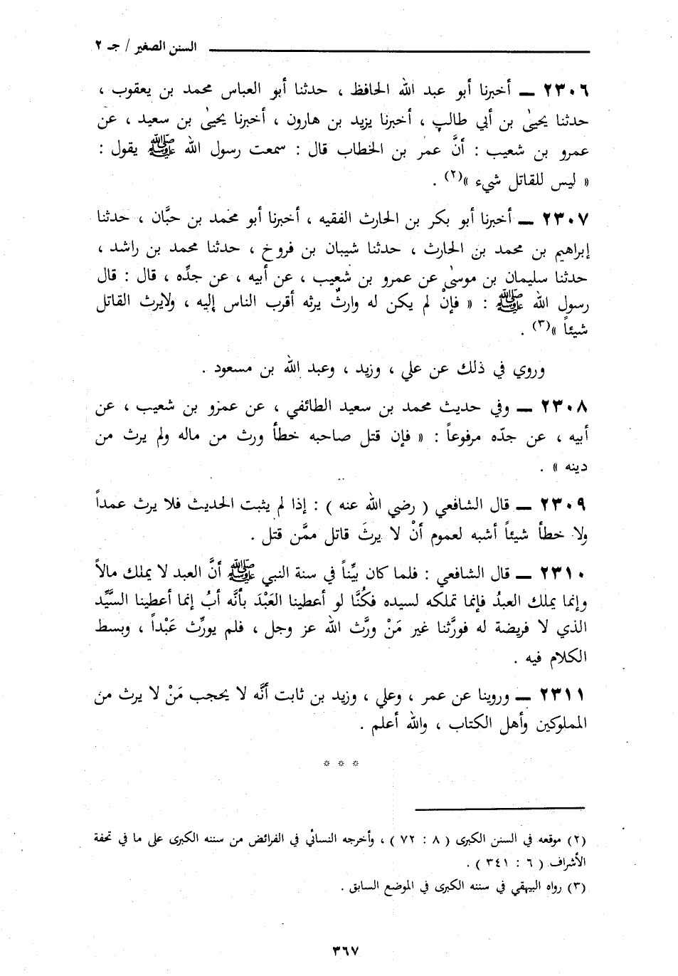 2306 - أَخْبَرَنَا أَبُو عَبْدِ اللَّهِ الْحَافِظُ، ثنا أَبُو الْعَبَّاسِ مُحَمَّدُ بْنُ يَعْقُوبَ، ثنا يَحْيَى بْنُ أَبِي طَالِبٍ، نا يَزِيدُ بْنُ هَارُونَ، نا يَحْيَى بْنُ سَعِيدٍ، عَنْ عَمْرِو بْنِ شُعَيْبٍ،: أَنَّ عُمَرَ بْنَ الْخَطَّابِ، قَالَ: سَمِعْتُ رَسُولَ اللَّهِ صَلَّى اللهُ عَلَيْهِ وَسَلَّمَ يَقُولُ: § «لَيْسَ لِلْقَاتِلِ شَيْءٌ»