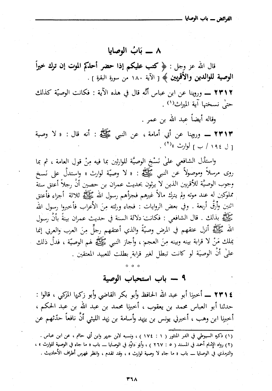 2313 - وَاسْتَدَلَّ الشَّافِعِيُّ عَلَى نَسْخِ الْوَصِيَّةِ لِلْوَارِثِينَ بِمَا فِيهِ مِنْ قَوْلِ الْعَامَّةِ، ثُمَّ بِمَا رُوِيَ مُرْسَلًا وَمَوْصُولًا عَنِ النَّبِيِّ صَلَّى اللهُ عَلَيْهِ وَسَلَّمَ: «لَا وَصِيَّةَ لِوَارِثٍ» وَاسْتَدَلَّ عَلَى نَسْخِ وُجُوبِ الْوَصِيَّةِ لِلْأَقْرَبِينَ الَّذِينَ لَا يَرِثُونَ بِحَدِيثِ عِمْرَانَ بْنِ حُصَيْنٍ أَنَّ رَجُلًا أَعْتَقَ سِتَّةَ مَمْلُوكِينَ لَهُ عِنْدَ مَوْتِهِ، وَلَمْ يَتْرُكْ مَالًا غَيْرَهُمْ §فَجَزَّأَهُمْ رَسُولُ اللَّهِ صَلَّى اللهُ عَلَيْهِ وَسَلَّمَ ثَلَاثَةَ أَجْزَاءٍ فَأَعْتَقَ اثْنَيْنِ وَأَرَقَّ أَرْبَعَةً، وَفِي بَعْضِ الرِّوَايَاتِ: فَجَاءَ وَرَثَتُهُ مِنَ الْأَعْرَابِ فَأَخْبَرُوا رَسُولَ اللَّهِ صَلَّى اللهُ عَلَيْهِ وَسَلَّمَ بِذَلِكَ، قَالَ الشَّافِعِيُّ: «فَكَانَتْ دَلَالَةُ السُّنَّةِ فِي حَدِيثِ عِمْرَانَ بَيِّنَةٌ بِأَنَّ رَسُولَ اللَّهِ صَلَّى اللهُ عَلَيْهِ وَسَلَّمَ أَنْزَلَ عِتْقَهُمْ فِي الْمَرَضِ وَصِيَّةً، وَالَّذِي أَعْتَقَهُمْ رَجُلٌ مِنَ الْعَرَبِ، وَالْعَرَبِيُّ إِنَّمَا يَمْلِكُ مَنْ لَا قَرَابَةَ بَيْنَهُ وَبَيْنَهُ مِنَ الْعَجَمِ، وَأَجَازَ النَّبِيُّ صَلَّى اللهُ عَلَيْهِ وَسَلَّمَ لَهُمُ الْوَصِيَّةَ، فَدَلَّ ذَلِكَ عَلَى أَنَّ الْوَصِيَّةَ لَوْ كَانَتْ تَبْطُلُ لِغَيْرِ قَرَابَةٍ بَطَلَتْ لِلْعَبِيدِ الْمُعْتَقِينَ»