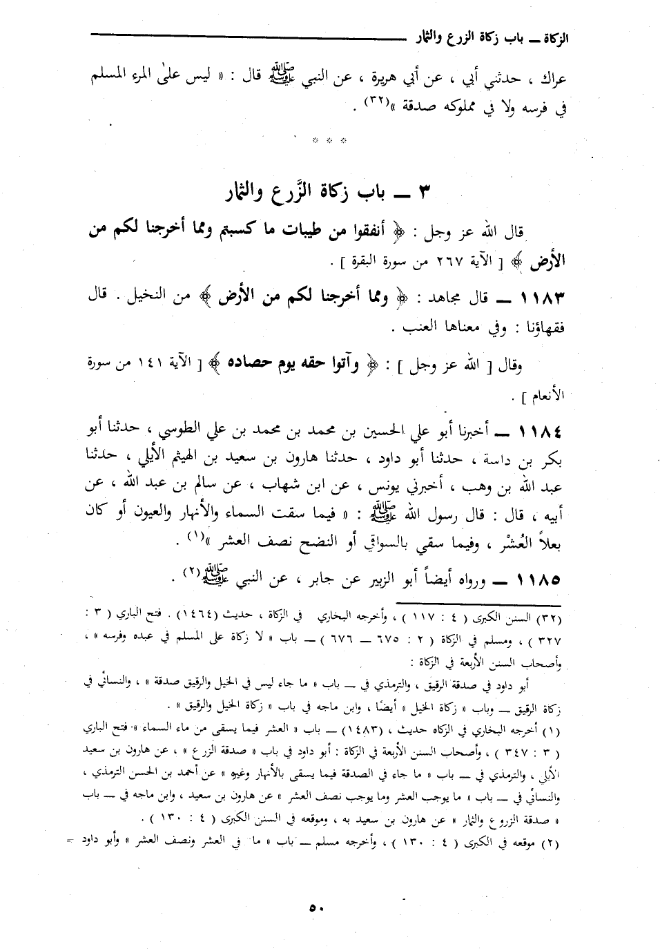 1184 - أَخْبَرَنَا أَبُو عَلِيٍّ الْحُسَيْنُ بْنُ مُحَمَّدِ بْنِ مُحَمَّدِ بْنِ عَلِيٍّ الطُّوسِيُّ، ثنَا أَبُو بَكْرِ بْنُ دَاسَةَ، ثنا أَبُو دَاوُدَ، ثنا هَارُونُ بْنُ سَعِيدِ بْنِ الْهَيْثَمِ الْأَيْلِيُّ، ثنا عَبْدُ اللَّهِ بْنُ وَهْبٍ، أَخْبَرَنِي يُونُسُ، عَنِ ابْنِ شِهَابٍ، عَنْ سَالِمِ بْنِ عَبْدِ اللَّهِ، عَنْ أَبِيهِ، قَالَ: قَالَ رَسُولُ اللَّهِ صَلَّى اللهُ عَلَيْهِ وَسَلَّمَ: «§فِيمَا سَقَتِ السَّمَاءُ وَالْأَنْهَارُ أَوِ الْعُيُونُ، أَوْ كَانَ بَعْلًا الْعُشْرُ، وَفِيمَا سُقِيَ بِالسَّوَاقِي أَوِ النَّضْحِ نِصْفُ الْعُشْرِ»