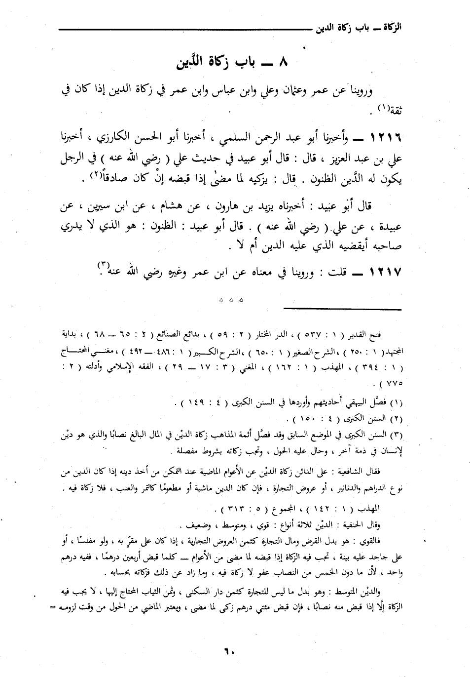 1216 - وَأَخْبَرَنَا أَبُو عَبْدِ الرَّحْمَنِ السُّلَمِيُّ، أَنَا أَبُو الْحَسَنِ الْكَارِزِيُّ، أَنَا عَلِيُّ بْنُ عَبْدِ الْعَزِيزِ، قَالَ: قَالَ أَبُو عُبَيْدٍ فِي حَدِيثِ عَلِيٍّ رَضِيَ اللَّهُ عَنْهُ فِي الرَّجُلِ يَكُونُ لَهُ الدَّيْنُ الظَّنُونِ، قَالَ: § «يُزَكِّيهِ»