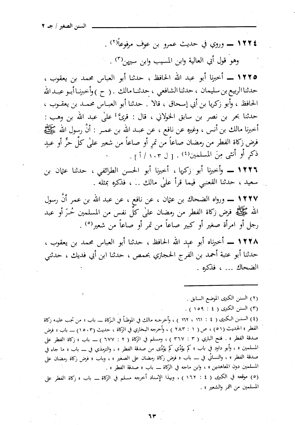 1225 - أَخْبَرَنَا أَبُو عَبْدِ اللَّهِ الْحَافِظُ، نَا أَبُو الْعَبَّاسِ مُحَمَّدُ بْنُ يَعْقُوبَ، نَا الرَّبِيعُ، نَا الشَّافِعِيُّ، نَا مَالِكٌ، ح وَأَخْبَرَنَا أَبُو عَبْدِ اللَّهِ الْحَافِظُ، وَأَبُو زَكَرِيَّا بْنُ أَبِي إِسْحَاقَ قَالَا: ثَنَا أَبُو الْعَبَّاسِ مُحَمَّدُ بْنُ يَعْقُوبَ، نَا مُحَمَّدُ بْنُ نَصْرِ بْنِ سَابِقٍ الْخَوْلَانِيُّ، قَالَ: قُرِئَ عَلَى عَبْدِ اللَّهِ بْنِ وَهْبٍ: أَنَا مَالِكُ بْنُ أَنَسٍ، وَغَيْرِهِ، عَنْ نَافِعٍ، عَنْ عَبْدِ اللَّهِ بْنِ عُمَرَ: أَنَّ رَسُولَ اللَّهِ صَلَّى اللهُ عَلَيْهِ وَسَلَّمَ: «§فَرَضَ زَكَاةَ الْفِطْرِ مِنْ رَمَضَانَ صَاعًا مِنْ تَمْرٍ، أَوْ صَاعًا مِنْ شَعِيرٍ عَلَى كُلِّ حُرٍّ، أَوْ عَبْدٍ ذَكَرٍ، أَوْ أُنْثَى مِنَ الْمُسْلِمِينَ»