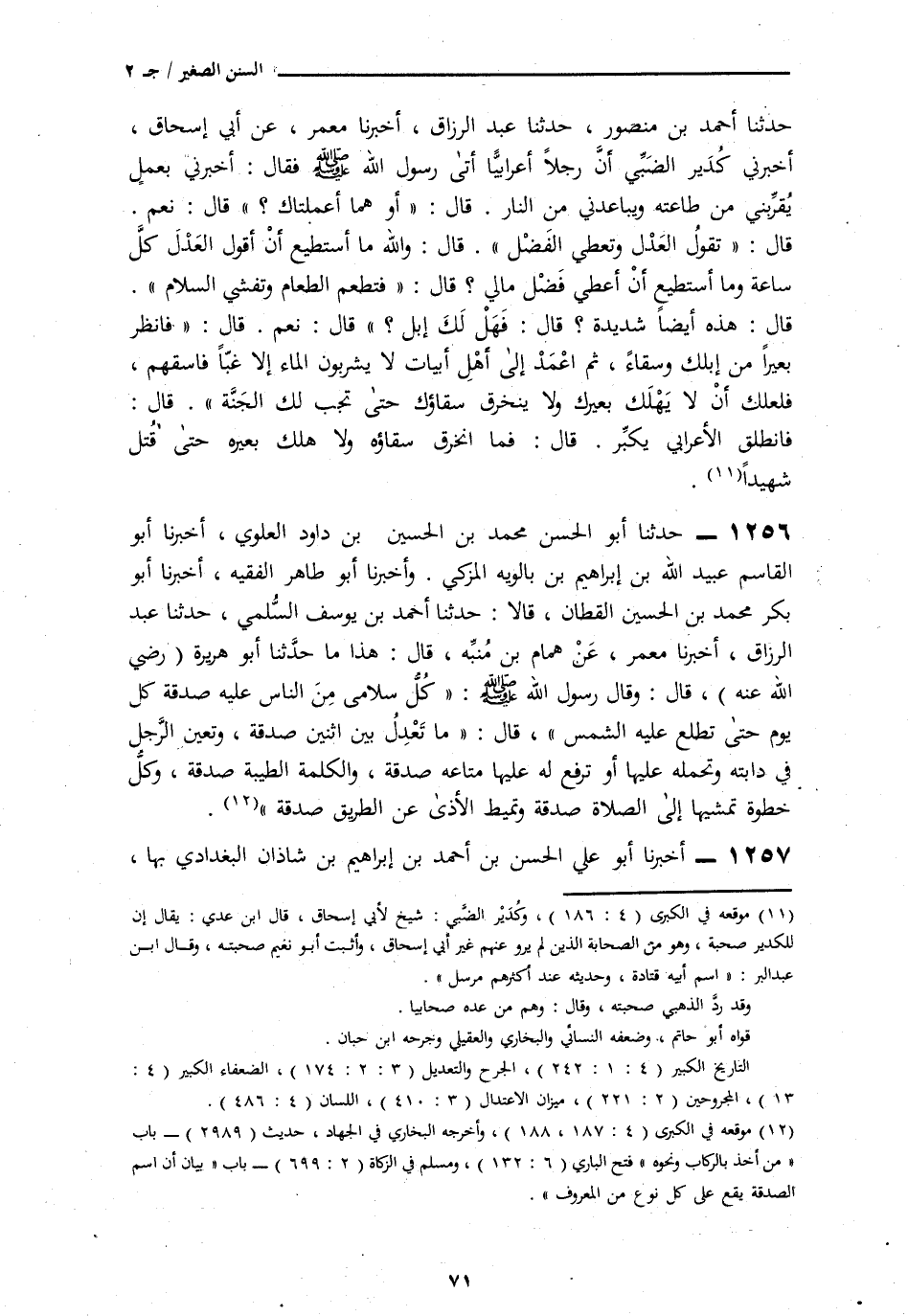 1256 - حَدَّثَنا أَبُو الْحَسَنِ مُحَمَّدُ بْنُ الْحُسَيْنِ بْنِ دَاوُدَ الْعَلَوِيُّ، أَنَا أَبُو الْقَاسِمِ عُبَيْدُ اللَّهِ بْنُ إِبْرَاهِيمَ بْنِ بَالَوَيْهِ الْمُزَكِّي، وَأَخْبَرَنَا أَبُو طَاهِرٍ الْفَقِيهُ، أَنَا أَبُو بَكْرٍ، مُحَمَّدُ بْنُ الْحُسَيْنِ الْقَطَّانُ قَالَا: نَا أَحْمَدُ بْنُ يُوسُفَ السُّلَمِيُّ، نَا عَبْدُ الرَّزَّاقِ، أَنَا مَعْمَرٌ، عَنْ هَمَّامِ بْنِ مُنَبِّهٍ، قَالَ: هَذَا مَا حَدَّثَنَا أَبُو هُرَيْرَةَ، رَضِيَ اللَّهُ عَنْهُ قَالَ: وَقَالَ رَسُولُ اللَّهِ صَلَّى اللهُ عَلَيْهِ وَسَلَّمَ: «كُلُّ سُلَامَى مِنَ النَّاسِ عَلَيْهِ صَدَقَةٌ كُلَّ يَوْمٍ تَطْلُعُ عَلَيْهِ الشَّمْسُ» قَالَ: «§مَا تَعْدِلُ بَيْنَ اثْنَيْنِ صَدَقَةٌ، وَتُعِينُ الرَّجُلَ فِي دَابَّتِهِ وَتَحْمِلُهُ عَلَيْهَا أَوْ تَرْفَعُ لَهُ عَلَيْهَا مَتَاعَهُ صَدَقَةٌ، وَالْكَلِمَةُ الطَّيِّبَةُ صَدَقَةٌ، وَكُلُّ خُطْوَةٍ تَمْشِيهَا إِلَى الصَّلَاةِ صَدَقَةٌ وَتُمِيطُ الْأَذَى عَنِ الطَّرِيقِ صَدَقَةٌ»