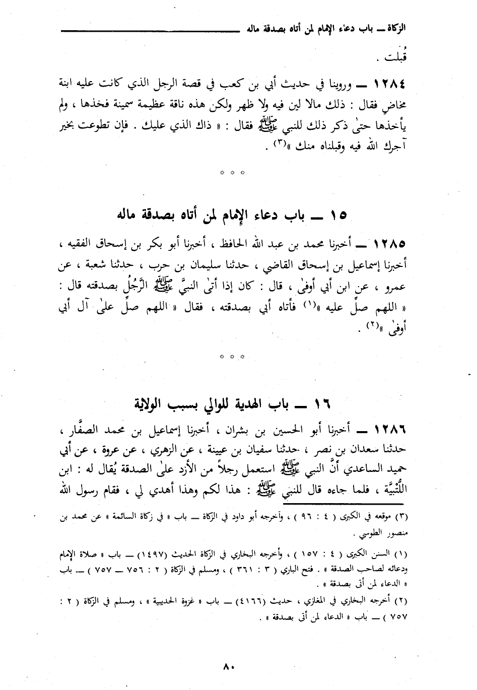 1285 - أَخْبَرَنَا مُحَمَّدُ بْنُ عَبْدِ اللَّهِ الْحَافِظُ، أَنَا أَبُو بَكْرِ بْنُ إِسْحَاقَ الْفَقِيهُ، أَنَا إِسْمَاعِيلُ بْنُ إِسْحَاقَ الْقَاضِي، نَا سُلَيْمَانُ بْنُ حَرْبٍ، نَا شُعْبَةُ، عَنْ عَمْرِو بْنِ مُرَّةَ، عَنْ عَبْدِ اللَّهِ بْنِ أَبِي أَوْفَى، قَالَ: كَانَ إِذَا أَتَى النَّبِيَّ صَلَّى اللهُ عَلَيْهِ وَسَلَّمَ الرَّجُلُ بِصَدَقَتِهِ قَالَ: «اللَّهُمَّ صَلِّ عَلَيْهِ» فَأَتَاهُ أَبِي بِصَدَقَتِهِ فَقَالَ: § «اللَّهُمَّ صَلِّ عَلَى آلِ أَبِي أَوْفَى»