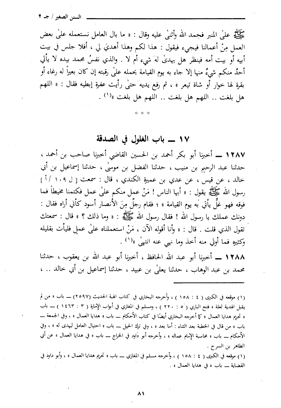 1287 - أَخْبَرَنَا أَبُو بَكْرٍ أَحْمَدُ بْنُ الْحُسَيْنِ الْقَاضِي، أَنَا حَاجِبُ بْنُ أَحْمَدَ، نَا عَبْدُ الرَّحِيمِ بْنُ مُنِيبٍ، نَا الْفَضْلُ بْنُ مُوسَى، نَا إِسْمَاعِيلُ بْنُ أَبِي خَالِدٍ -[82]-، عَنْ قَيْسٍ، عَنْ عَدِيِّ بْنِ عَمِيرَةَ الْكِنْدِيِّ، قَالَ: سَمِعْتُ رَسُولَ اللَّهِ صَلَّى اللهُ عَلَيْهِ وَسَلَّمَ يَقُولُ: § «أَيُّهَا النَّاسُ مَنْ عَمِلَ مِنْكُمْ عَلَى عَمَلٍ فَكَتَمَ مَخِيطًا فَمَا فَوْقَهُ، فَهُوَ غُلٌّ يَأْتِي بِهِ يَوْمَ الْقِيَامَةِ» فَقَامَ رَجُلٌ مِنَ الْأَنْصَارِ أَسْوَدُ كَأَنِّي أَرَاهُ فَقَالَ: دُونَكَ عَمَلَكَ يَا رَسُولَ اللَّهِ، فَقَالَ رَسُولُ اللَّهِ صَلَّى اللهُ عَلَيْهِ وَسَلَّمَ: «وَمَا ذَلِكَ؟» قَالَ: سَمِعْتُكَ تَقُولُ الَّذِي قُلْتَ قَالَ: " وَأَنَا أَقُولُهُ الْآنَ: مَنِ اسْتَعْمَلْنَاهُ عَلَى عَمَلٍ فَلْيَأْتِ بِقَلِيلِهِ وَكَثِيرِهِ فَمَا أُوتِيَ مِنْهُ أَخَذَ وَمَا نُهِيَ عَنْهُ انْتَهَى "
