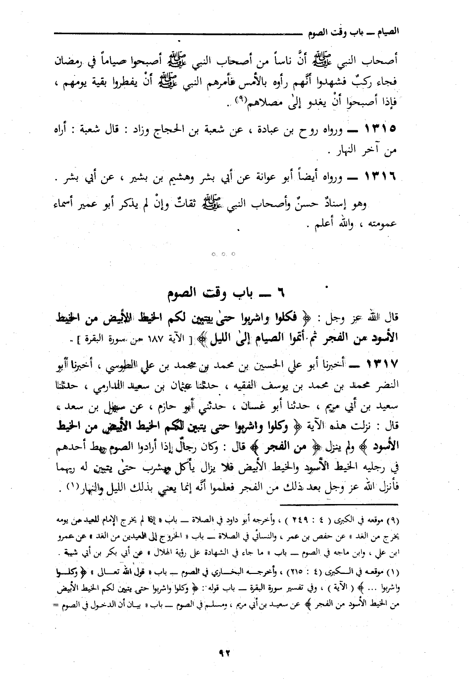 1317 - أَخْبَرَنَا أَبُو عَلِيٍّ الْحُسَيْنُ بْنُ مُحَمَّدِ بْنِ عَلِيٍّ الطُّوسِيُّ، أَنَا أَبُو النَّضْرِ مُحَمَّدُ بْنُ مُحَمَّدِ بْنِ يُوسُفَ الْفَقِيهُ، أَنَا عُثْمَانُ بْنُ سَعِيدٍ الدَّارِمِيُّ، أَنَا سَعِيدُ بْنُ أَبِي مَرْيَمَ، نَا أَبُو غَسَّانَ، حَدَّثَنِي أَبُو حَازِمٍ، عَنْ سَهْلِ بْنِ سَعْدٍ، قَالَ: " نَزَلَتْ هَذِهِ الْآيَةُ {وَكُلُوا وَاشْرَبُوا حَتَّى يَتَبَيَّنَ لَكُمُ الْخَيْطُ الْأَبْيَضُ مِنَ الْخَيْطِ الْأَسْوَدِ} [البقرة: 187] وَلَمْ يَنْزِلْ {مِنَ الْفَجْرِ} [البقرة: 187] قَالَ: وَكَانَ رِجَالٌ إِذَا أَرَادُوا الصَّوْمَ رَبَطَ أَحَدُهُمْ فِي رِجْلَيْهِ الْخَيْطَ الْأَسْوَدَ، وَالْخَيْطَ الْأَبْيَضَ وَلَا يَزَالُ يَأْكُلُ وَيَشْرَبُ، حَتَّى يَتَبَيَّنَ لَهُ رؤيَتُهُمَا فَأَنْزَلَ اللَّهُ عَزَّ وَجَلَّ بَعْدَ ذَلِكَ {مِنَ الْفَجْرِ} [البقرة: 187] §فَعَلِمُوا أَنَّهُ إِنَّمَا يَعْنِي بِذَلِكَ اللَّيْلَ وَالنَّهَارَ " -[93]-