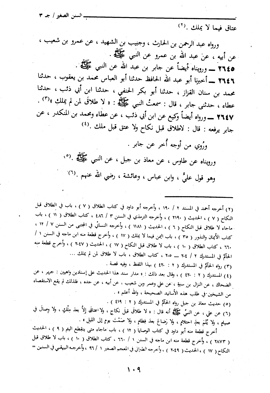 2646 - أَخْبَرَنَا أَبُو عَبْدِ اللَّهِ الْحَافِظُ، ثنا أَبُو الْعَبَّاسِ مُحَمَّدُ بْنُ يَعْقُوبَ، ثنا مُحَمَّدُ بْنُ سِنَانٍ الْقَزَّازُ، ثنا أَبُو بَكْرٍ الْحَنَفِيُّ، ثنا ابْنُ أَبِي ذِئْبٍ، ثنا عَطَاءٌ، حَدَّثَنِي جَابِرٌ، قَالَ: سَمِعْتُ النَّبِيَّ صَلَّى اللهُ عَلَيْهِ وَسَلَّمَ يَقُولُ: «§لَا طَلَاقَ لِمَنْ لَمْ يَمْلِكْ، وَلَا عَتَاقَ لِمَنْ لَمْ يَمْلِكْ»