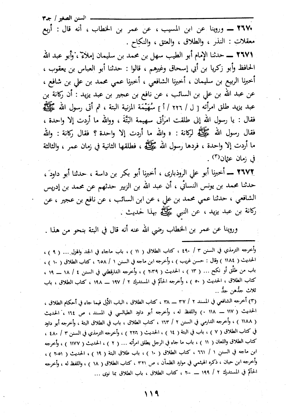 2671 - حَدَّثَنَا الْإِمَامُ أَبُو الطَّيِّبِ سَهْلُ بْنُ مُحَمَّدِ بْنِ سُلَيْمَانَ إِمْلَاءً وَأَبُو عَبْدِ اللَّهِ الْحَافِظُ، وَأَبُو زَكَرِيَّا بْنُ أَبِي إِسْحَاقَ، وَغَيْرُهُمْ، قَالُوا: ثنا أَبُو الْعَبَّاسِ مُحَمَّدُ بْنُ يَعْقُوبَ، أنا الرَّبِيعُ بْنُ سُلَيْمَانَ، أنا الشَّافِعِيُّ، أنا عَمِّي مُحَمَّدُ بْنُ عَلِيِّ بْنِ شَافِعٍ، عَنْ عَبْدِ اللَّهِ بْنِ عَلِيِّ بْنِ السَّائِبِ، عَنْ نَافِعِ بْنِ عُجَيْرِ بْنِ عَبْدِ يَزِيدَ، أَنَّ رُكَانَةَ بْنَ عَبْدِ يَزِيدَ، §طَلَّقَ امْرَأَتَهُ سُهَيْمَةَ الْمُزَنِيَّةَ الْبَتَّةَ، ثُمَّ أَتَى رَسُولَ اللَّهِ صَلَّى اللهُ عَلَيْهِ وَسَلَّمَ فَقَالَ: يَا رَسُولَ اللَّهِ، إِنِّي طَلَّقْتُ امْرَأَتِي سُهَيْمَةَ الْبَتَّةَ، وَاللَّهِ مَا أَرَدْتُ إِلَّا وَاحِدَةً، فَقَالَ رَسُولُ اللَّهِ صَلَّى اللهُ عَلَيْهِ وَسَلَّمَ لِرُكَانَةَ: «وَاللَّهِ مَا أَرَدْتَ إِلَّا وَاحِدَةً؟» فَقَالَ رُكَانَةُ: «وَاللَّهِ مَا أَرَدْتُ إِلَّا وَاحِدَةً» فَرَدَّهَا إِلَيْهِ رَسُولُ اللَّهِ صَلَّى اللهُ عَلَيْهِ وَسَلَّمَ فَطَلَّقَهَا الثَّانِيَةَ فِي زَمَنِ عُمَرَ، وَالثَّالِثَةَ فِي زَمَنِ عُثْمَانَ