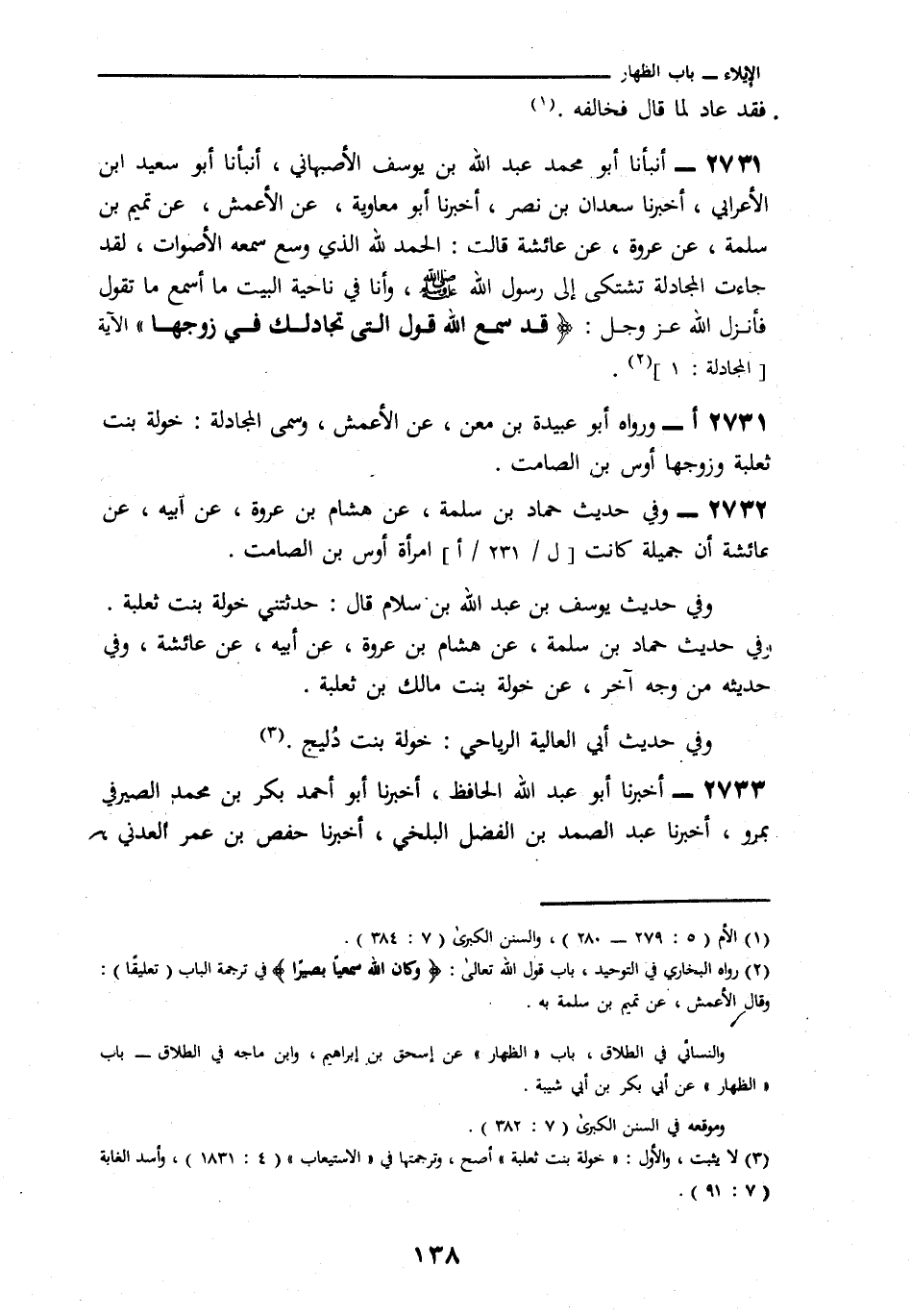 2731 - أَخْبَرَنَا أَبُو مُحَمَّدٍ عَبْدُ اللَّهِ بْنُ يُوسُفَ الْأَصْبَهَانِيُّ، أنا أَبُو سَعِيدِ بْنُ الْأَعْرَابِيِّ، ثنا سَعْدَانُ بْنُ نَصْرٍ، ثنا أَبُو مُعَاوِيَةَ، عَنِ الْأَعْمَشِ، عَنْ تَمِيمِ بْنِ سَلَمَةَ، عَنْ عُرْوَةَ، عَنْ عَائِشَةَ، قَالَتْ: " §الْحَمْدُ لِلَّهِ الَّذِي وَسِعَ سَمْعُهُ الْأَصْوَاتَ، لَقَدْ جَاءَتِ الْمُجَادِلَةُ تَشْتَكِي إِلَى رَسُولِ اللَّهِ صَلَّى اللهُ عَلَيْهِ وَسَلَّمَ، وَأَنَا فِي نَاحِيَةِ الْبَيْتِ مَا أَسْمَعُ مَا تَقُولُ فَأَنْزَلَ اللَّهُ عَزَّ وَجَلَّ: {قَدْ سَمِعَ اللَّهَ قَوْلَ الَّتِي تُجَادِلُكَ فِي زَوْجِهَا} [المجادلة: 1] " الْآيَةَ