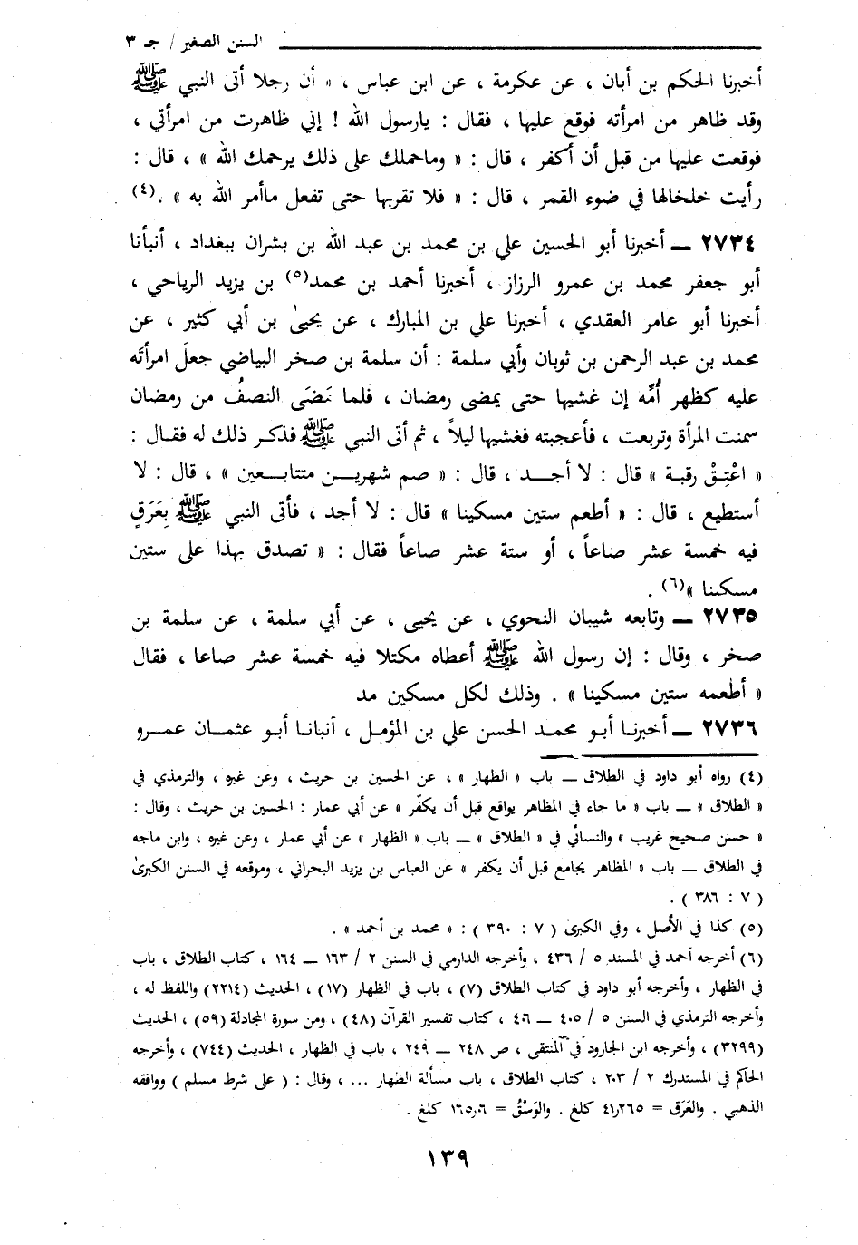 2734 - أَخْبَرَنَا أَبُو الْحُسَيْنِ عَلِيُّ بْنُ مُحَمَّدِ بْنِ عَبْدِ اللَّهِ بْنِ بِشْرَانَ بِبَغْدَادَ، أنا أَبُو جَعْفَرٍ مُحَمَّدُ بْنُ عَمْرٍو الرَّزَّازُ، ثنا مُحَمَّدُ بْنُ أَحْمَدَ بْنِ يَزِيدَ الرِّيَاحِيُّ، ثنا أَبُو عَامِرٍ الْعَقَدِيُّ، ثنا عَلِيُّ بْنُ المُبَارَكٍ، عَنْ يَحْيَى بْنِ أَبِي كَثِيرٍ، عَنْ مُحَمَّدِ بْنِ عَبْدِ الرَّحْمَنِ بْنِ ثَوْبَانَ، وَأَبِي سَلَمَةَ أَنَّ سَلَمَةَ بْنَ صَخْرٍ الْبَيَاضِيَّ، جَعَلَ امْرَأَتَهُ عَلَيْهِ كَظَهْرِ أُمِّهِ إِنْ غَشِيَهَا حَتَّى يَمْضِيَ رَمَضَانُ، فَلَمَّا مَضَى النِّصْفُ مِنْ رَمَضَانَ سَمُنَتِ الْمَرْأَةُ وَتَرَبَّعَتْ، فَأَعْجَبَتْهُ فَغَشِيَهَا لَيْلًا، ثُمَّ أَتَى النَّبِيَّ صَلَّى اللهُ عَلَيْهِ وَسَلَّمَ فَذَكَرَ ذَلِكَ لَهُ فَقَالَ: «§أَعْتِقْ رَقَبَةً» قَالَ: لَا أَجِدُ. فَقَالَ: «صُمْ شَهْرَيْنِ مُتَتَابِعَيْنِ» فَقَالَ: لَا أَسْتَطِيعُ قَالَ: «أَطْعِمْ سِتِّينَ مِسْكِينًا» قَالَ: لَا أَجِدُ قَالَ: فَأَتَى النَّبِيَّ صَلَّى اللهُ عَلَيْهِ وَسَلَّمَ بِعَرَقٍ فِيهِ خَمْسَةَ عَشَرَ صَاعًا، أَوْ سِتَّةَ عَشَرَ صَاعًا فَقَالَ: «تَصَدَّقْ بِهَذَا عَلَى سِتِّينَ مِسْكِينًا»