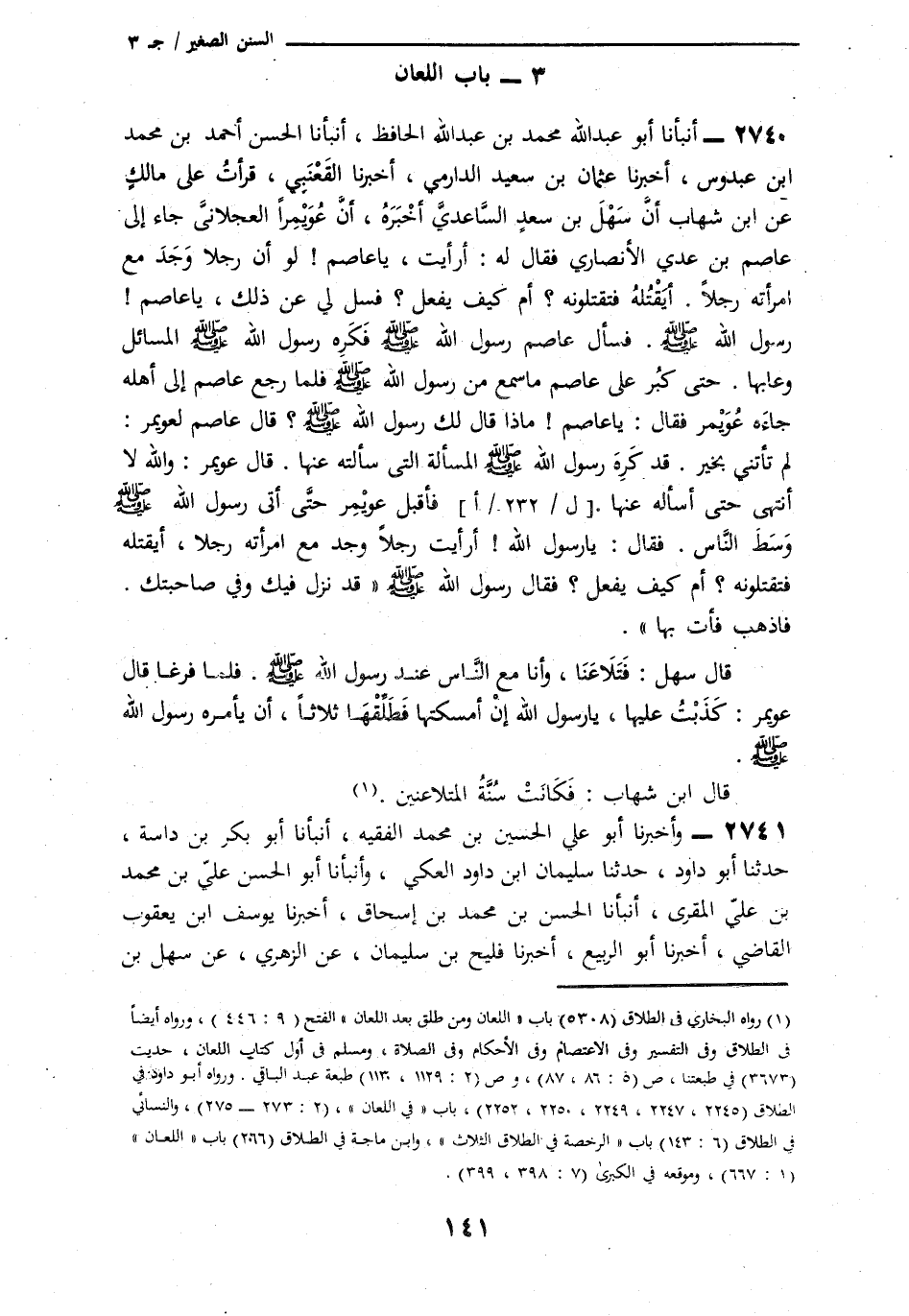 2740 - أَخْبَرَنَا أَبُو عَبْدِ اللَّهِ مُحَمَّدُ بْنُ عَبْدِ اللَّهِ الْحَافِظُ، أنا أَبُو الْحَسَنِ أَحْمَدُ بْنُ مُحَمَّدِ بْنِ عَبْدُوسَ، ثنا عُثْمَانُ بْنُ سَعِيدٍ الدَّارِمِيُّ، ثنا الْقَعْنَبِيُّ، فِيمَا قَرَأَ عَلَى مَالِكٍ عَنِ ابْنِ شِهَابٍ، أَنَّ سَهْلَ بْنَ سَعْدٍ السَّاعِدِيَّ، أَخْبَرَهُ أَنَّ عُوَيْمِرَ بْنَ أَشْقَرِ الْعَجْلَانِيَّ جَاءَ إِلَى عَاصِمِ بْنِ عَدِيٍّ الْأَنْصَارِيِّ فَقَالَ لَهُ: يَا عَاصِمُ أَرَأَيْتَ لَوْ أَنَّ رَجُلًا وَجَدَ مَعَ امْرَأَتِهِ رَجُلًا أَيَقْتُلُهُ فَتَقْتُلُونَهُ؟ أَمْ كَيْفَ يَفْعَلُ؟ سَلْ لِي يَا عَاصِمُ عَنْ ذَلِكَ رَسُولَ اللَّهِ صَلَّى اللهُ عَلَيْهِ وَسَلَّمَ. فَسَأَلَ عَاصِمٌ رَسُولَ اللَّهِ صَلَّى اللهُ عَلَيْهِ وَسَلَّمَ فَكَرِهَ رَسُولُ اللَّهِ صَلَّى اللهُ عَلَيْهِ وَسَلَّمَ الْمَسَائِلَ، وَعَابَهَا حَتَّى كَبُرَ عَلَى عَاصِمٍ مَا سَمِعَ مِنْ رَسُولِ اللَّهِ صَلَّى اللهُ عَلَيْهِ وَسَلَّمَ، فَلَمَّا رَجَعَ عَاصِمٌ إِلَى أَهْلِهِ جَاءَهُ عُوَيْمِرٌ فَقَالَ: يَا عَاصِمُ، مَاذَا قَالَ لَكَ رَسُولُ اللَّهِ صَلَّى اللهُ عَلَيْهِ وَسَلَّمَ؟ فَقَالَ عَاصِمٌ لِعُوَيْمِرٍ: لَمْ تَأْتِ بِخَيْرٍ قَدْ كَرِهَ رَسُولُ اللَّهِ صَلَّى اللهُ عَلَيْهِ وَسَلَّمَ الْمَسْأَلَةَ الَّتِي سَأَلْتُهُ عَنْهَا. فَقَالَ عُوَيْمِرٌ: وَاللَّهِ لَا أَنْتَهِي حَتَّى أَسْأَلَهُ عَنْهَا فَأَقْبَلَ عُوَيْمِرٌ حَتَّى أَتَى رَسُولَ اللَّهِ صَلَّى اللهُ عَلَيْهِ وَسَلَّمَ وَهُوَ وَسَطَ النَّاسِ فَقَالَ: يَا رَسُولَ اللَّهِ، أَرَأَيْتَ رَجُلًا وَجَدَ مَعَ امْرَأَتِهِ رَجُلًا أَيَقْتُلُهُ فَتَقْتُلُونَهُ؟ أَمْ كَيْفَ يَفْعَلُ؟ فَقَالَ النَّبِيُّ صَلَّى اللهُ عَلَيْهِ وَسَلَّمَ: § «قَدْ أُنْزِلَ فِيكَ وَفِي صَاحِبَتِكَ فَاذْهَبْ فَائْتِ بِهَا» فَقَالَ سَهْلُ بْنُ سَعْدٍ: فَتَلَاعَنَا، وَأَنَا مَعَ النَّاسِ عِنْدَ رَسُولِ اللَّهِ صَلَّى اللهُ عَلَيْهِ وَسَلَّمَ فَلَمَّا فَرَغَا قَالَ عُوَيْمِرٌ: كَذَبْتُ عَلَيْهَا يَا رَسُولَ اللَّهِ إِنْ أَمْسَكْتُهَا فَطَلَّقَهَا عُوَيْمِرٌ ثَلَاثًا قَبْلَ أَنْ يَأْمُرَهُ رَسُولُ اللَّهِ صَلَّى اللهُ عَلَيْهِ وَسَلَّمَ. قَالَ ابْنُ شِهَابٍ: فَكَانَتْ تِلْكَ سُنَّةَ الْمُتَلَاعِنَيْنِ "