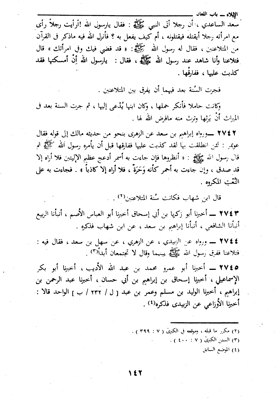 2742 - وَرَوَاهُ إِبْرَاهِيمُ بْنُ سَعْدٍ عَنِ الزُّهْرِيِّ، بِنَحْو مِنْ حَدِيثِ مَالِكٍ إِلَى قَوْلِهِ فَقَالَ عُوَيْمِرٌ: لَئِنِ انْطَلَقْتَ بِهَا لَقَدْ كَذَبْتُ عَلَيْهَا فَفَارَقَهَا قَبْلَ أَنْ يَأْمُرَهُ رَسُولُ اللَّهِ صَلَّى اللهُ عَلَيْهِ وَسَلَّمَ ثُمَّ قَالَ رَسُولُ اللَّهِ صَلَّى اللهُ عَلَيْهِ وَسَلَّمَ: § «انْظُرُوهَا فَإِنْ جَاءَتْ بِهِ أَسْحَمَ أَدْعَجَ عَظِيمَ الْأَلْيَتَيْنِ فَلَا أُرَاهُ إِلَّا قَدْ صَدَقَ، وَإِنْ جَاءَتْ بِهِ أَحْمَرَ كَأَنَّهُ وَحَرَةٌ، فَلَا أُرَاهُ إِلَّا كَاذِبًا» فَجَاءَتْ بِهِ عَلَى النَّعْتِ الْمَكْرُوهِ. قَالَ ابْنُ شِهَابٍ: فَصَارَتْ سُنَّةَ الْمُتَلَاعِنَيْنِ.