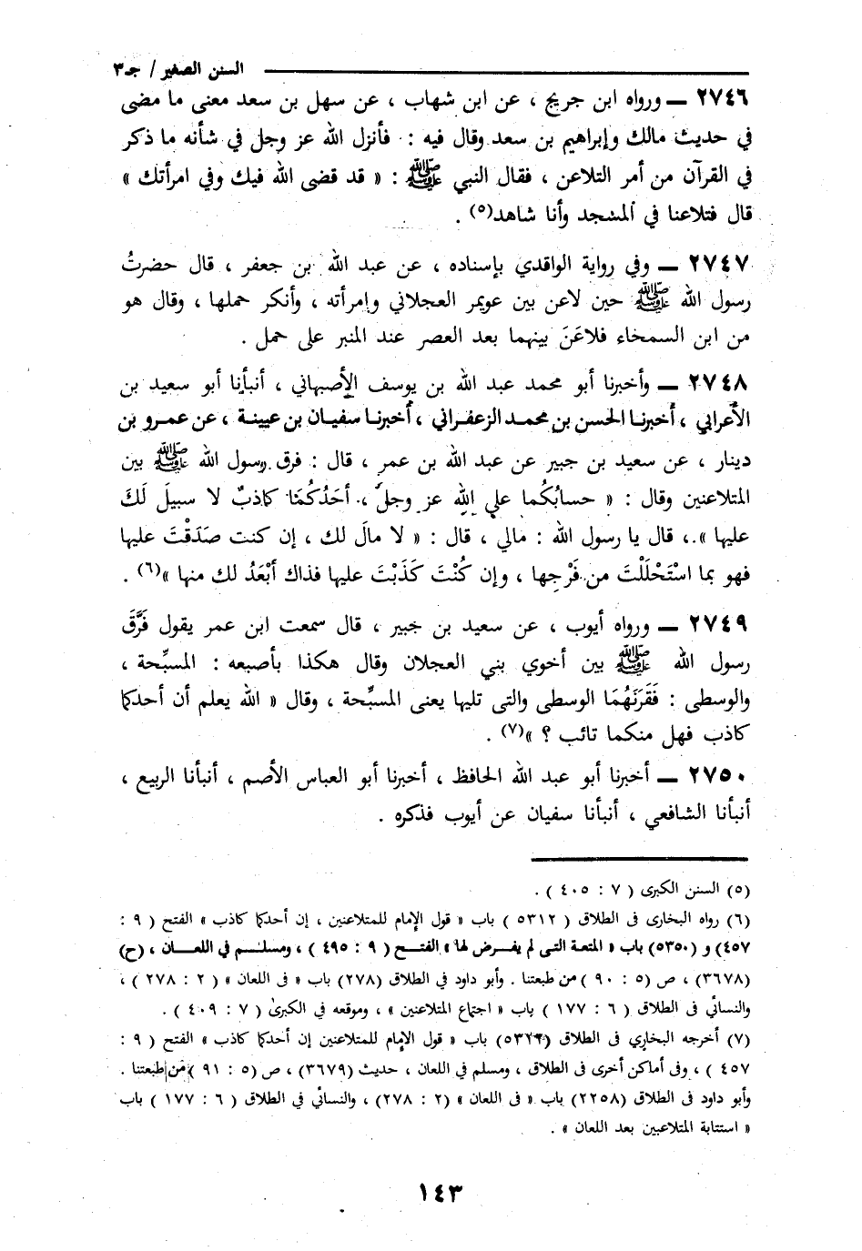 2748 - وَأَخْبَرَنَا أَبُو مُحَمَّدٍ عَبْدُ اللَّهِ بْنُ يُوسُفَ الْأَصْبَهَانِيُّ، أنا أَبُو سَعِيدِ بْنُ الْأَعْرَابِيِّ، ثنا الْحَسَنُ بْنُ مُحَمَّدٍ الزَّعْفَرَانِيُّ، ثنا سُفْيَانُ بْنُ عُيَيْنَةَ، عَنْ عَمْرِو بْنِ دِينَارٍ، عَنْ سَعِيدِ بْنِ جُبَيْرٍ، عَنْ عَبْدِ اللَّهِ بْنِ عُمَرَ، قَالَ: فَرَّقَ رَسُولُ اللَّهِ صَلَّى اللهُ عَلَيْهِ وَسَلَّمَ بَيْنَ الْمُتَلَاعِنَيْنِ وَقَالَ: «§حِسَابُكُمَا عَلَى اللَّهِ عَزَّ وَجَلَّ، أَحَدُكُمَا كَاذِبٌ لَا سَبِيلَ لَكَ عَلَيْهَا» قَالَ: يَا رَسُولَ اللَّهِ: مَالِي؟ قَالَ «لَا مَالَ لَكَ، إِنْ كُنْتَ صَدَقْتَ عَلَيْهَا فَهُوَ بِمَا اسْتَحْلَلْتَ مِنْ فَرْجِهَا، وَإِنْ كُنْتَ كَذَبْتَ عَلَيْهَا فَذَلكَ أَبْعَدُ لَكَ مِنْهَا»