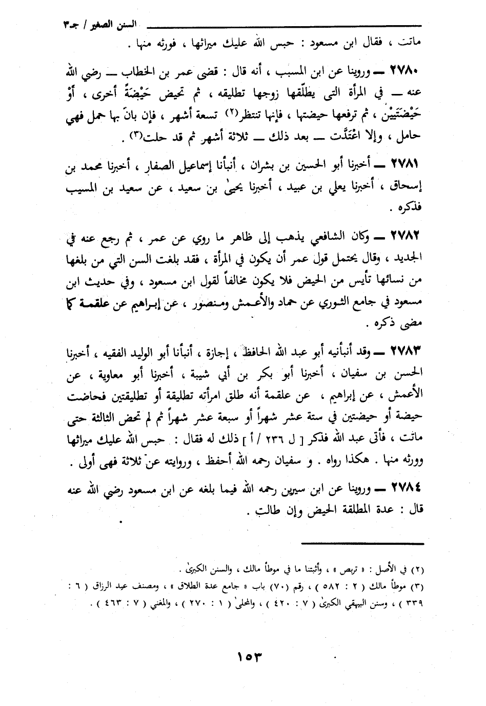 2782 - وَكَانَ الشَّافِعِيُّ يَذْهَبُ إِلَى ظَاهِرِ مَا رُوِيَ عَنْ عُمَرَ، ثُمَّ رَجَعَ عَنْهُ فِي الْجَدِيدِ، وَقَالَ: «يَحْتَمِلُ قَوْلُ عُمَرَ أَنْ يَكُونَ فِي الْمَرْأَةِ، قَدْ بَلَغَتِ مِنَ السِّنِّ الَّتِي مَنْ بَلَغَهَا مِنْ نِسَائِهَا يَئِسْنَ مِنَ الْمَحِيضِ فَلَا يَكُونُ مُخَالِفًا لِقَوْلِ ابْنِ مَسْعُودٍ وَفِي حَدِيثِ ابْنِ مَسْعُودٍ فِي جَامِعِ الثَّوْرِيِّ» عَنْ حَمَّادٍ، وَالْأَعْمَشِ، وَمَنْصُورٍ، عَنْ إِبْرَاهِيمَ، عَنْ عَلْقَمَةَ، كَمَا مَضَى ذِكْرُهُ