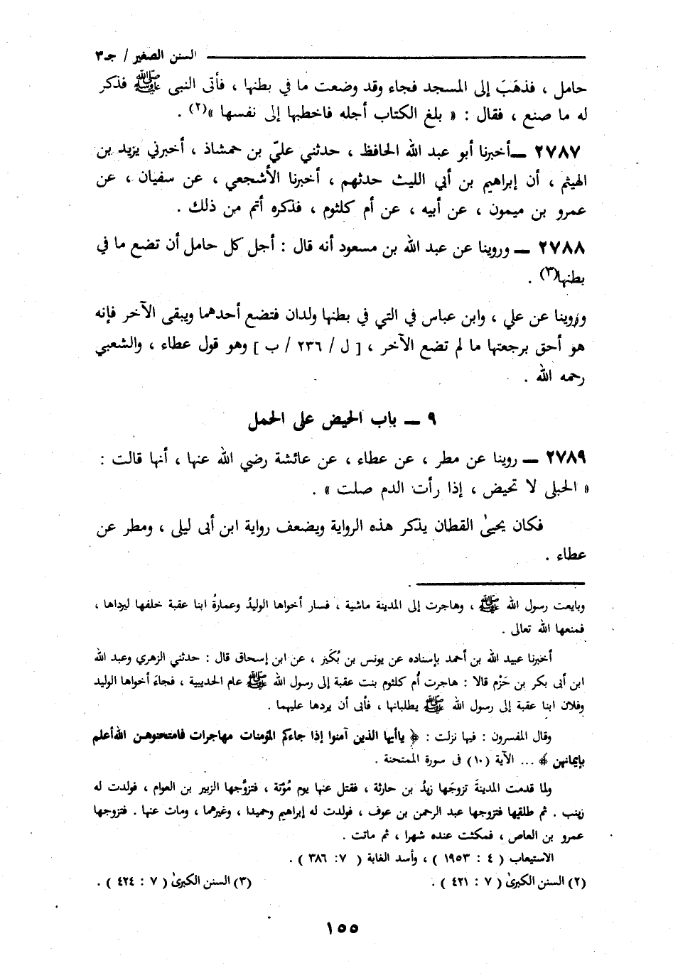 2789 - رُوِّينَا عَنْ مَطَرٍ، عَنْ عَطَاءٍ، عَنْ عَائِشَةَ، رَضِيَ اللَّهُ عَنْهَا، أَنَّهَا قَالَتِ: § «الْحُبْلَى لَا تَحِيضُ، إِذَا رَأَتِ الدَّمَ صَلَّتْ» فَكَانَ يَحْيَى الْقَطَّانُ يُنْكُرُ هَذِهِ الرِّوَايَةَ، وَيُضَعِّفُ رِوَايَةَ ابْنِ أَبِي لَيْلَى، وَمَطَرٍ، عَنْ عَطَاءٍ -[156]-، وَقَالَ إِسْحَاقُ الْحَنْظَلِيُّ، قَالَ لِي أَحْمَدُ بْنُ حَنْبَلٍ رَحِمَهُ اللَّهُ: «مَا تَقُولُ فِي الْحَامِلِ تَرَى الدَّمَ؟» فَقُلْتُ: تُصَلِّي، وَاحْتَجَجْتُ بِخَبَرِ عَطَاءٍ عَنْ عَائِشَةَ " قَالَ: فَقَالَ لِي أَحْمَدُ بْنُ حَنْبَلٍ: «أَيْنَ أَنْتَ عَنْ خَبَرِ الْمَدَنِيِّينَ، خَبَرِ أُمِّ عَلْقَمَةَ عَنْ عَائِشَةَ، فَإِنَّهُ أَصَحُّ» قَالَ إِسْحَاقُ: «فَرَجَعْتُ إِلَى قَوْلِ أَحْمَدَ»