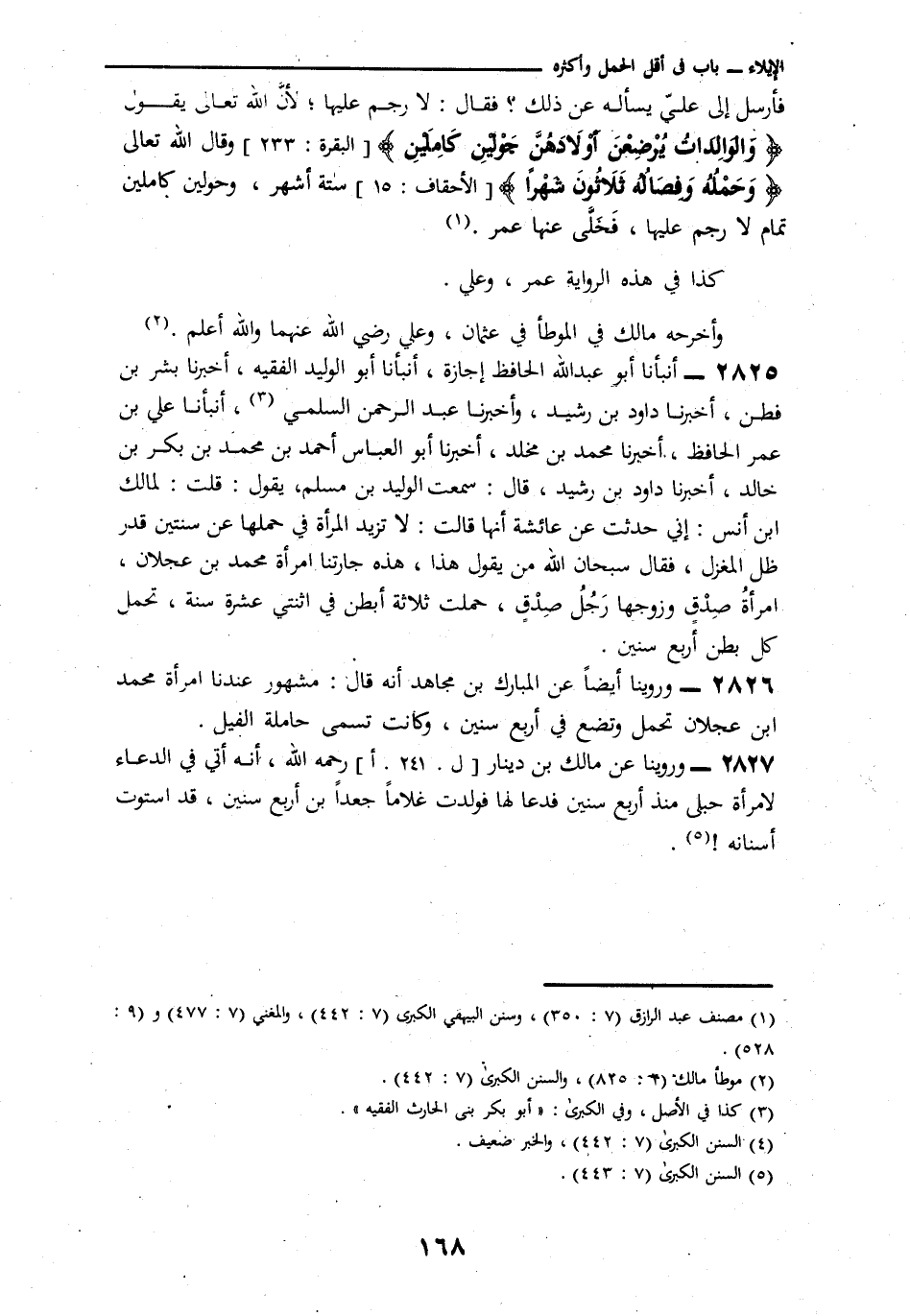 2825 - أَخْبَرَنَا أَبُو عَبْدِ اللَّهِ الْحَافِظُ، إِجَازَةً، أَنا أَبُو الْوَلِيدِ الْفَقِيهُ، ثنا بِشْرُ بْنُ فَطِنٍ، ثنا دَاوُدُ بْنُ رُشَيْدٍ، وَأَخْبَرَنَا أَبُو عَبْدُ الرَّحْمَنِ السُّلَمِيُّ، أنا عَلِيُّ بْنُ عُمَرَ الْحَافِظُ، ثنا مُحَمَّدُ بْنُ مَخْلَدٍ، ثنا أَبُو الْعَبَّاسِ أَحْمَدُ بْنُ مُحَمَّدِ بْنِ بَكْرِ بْنِ خَالِدٍ، ثنا دَاوُدُ بْنُ رُشَيْدٍ، قَالَ: سَمِعْتُ الْوَلِيدَ بْنَ مُسْلِمٍ، يَقُولُ: قُلْتُ: لِمَالِكِ بْنِ أَنَسٍ: إِنِّي حُدِّثْتُ عَنْ عَائِشَةَ، أَنَّهَا قَالَتْ: § «لَا تَزِيدُ الْمَرْأَةُ فِي حَمْلِهَا عَنْ سَنَتَيْنِ قَدْرَ ظِلِّ الْمِغْزَلِ» فَقَالَ: «سُبْحَانَ اللَّهِ مَنْ يَقُولُ هَذَا؟ هَذِهِ جَارَتُنَا امْرَأَةُ مُحَمَّدِ بْنِ عَجْلَانَ، امْرَأَةُ صِدْقٍ، وَزَوْجُهَا رَجُلُ صِدْقٌ حَمَلَتْ ثَلَاثَةَ أَبْطُنٍ فِي اثْنَتَيْ عَشْرَةَ سَنَةً، تَحْمِلُ كُلَّ بَطْنٍ أَرْبَعَ سِنِينَ»