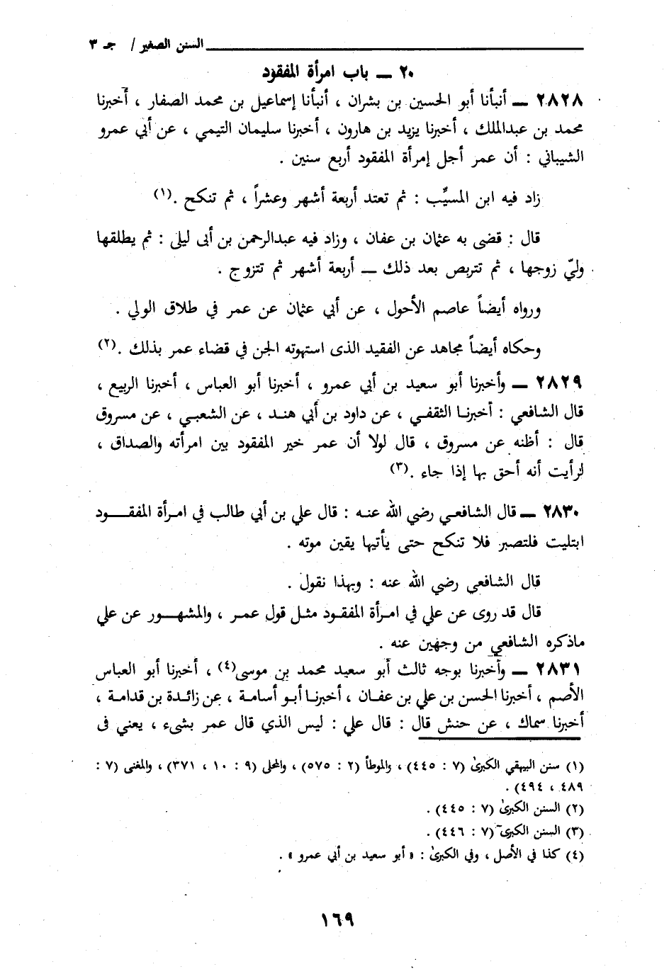 2830 - قَالَ وَقَدْ رُوِيَ عَنْ عَلِيٍّ، فِي §امْرَأَةِ الْمَفْقُودِ مِثْلُ قَوْلِ عُمَرَ، وَالْمَشْهُورُ عَنْ عَلِيٍّ مَا ذَكَرَهُ الشَّافِعِيُّ مِنْ وَجْهَيْنِ عَنْهُ