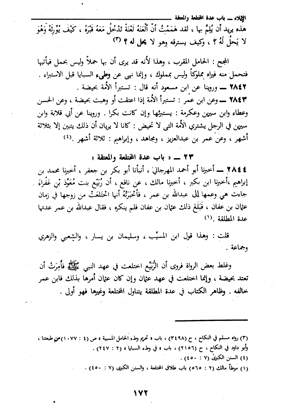 2844 - أَخْبَرَنَا أَبُو أَحْمَدَ الْمِهْرَجَانِيُّ، أنا أَبُو بَكْرِ بْنُ جَعْفَرٍ، ثنا مُحَمَّدُ بْنُ إِبْرَاهِيمَ، ثنا ابْنُ بُكَيْرٍ، ثنا مَالِكٌ، عَنْ نَافِعٍ،: أَنَّ رُبَيِّعَ بِنْتَ مُعَوِّذِ بْنِ عَفْرَاءَ، §جَاءَتْ هِيَ وَعَمُّهَا إِلَى عَبْدِ اللَّهِ بْنِ عُمَرَ، فَأَخْبَرَتْهُ أَنَّهَا اخْتَلَعَتْ مِنْ زَوْجِهَا فِي زَمَانِ عُثْمَانَ بْنِ عَفَّانَ، فَبَلَغَ ذَلِكَ عُثْمَانَ بْنَ عَفَّانَ فَلَمْ يُنْكِرْهُ، فَقَالَ عَبْدُ اللَّهِ بْنُ عُمَرَ: «عِدَّتُهَا عِدَّةُ الْمُطَلَّقَةِ» قُلْتُ: وَهَذَا قَوْلُ ابْنِ الْمُسَيِّبِ، وَسُلَيْمَانَ بْنِ يَسَارٍ، وَالشَّعْبِيِّ وَالزُّهْرِيِّ وَالْجَمَاعَةُ، وَغَلَطَ بَعْضُ الرُّوَاةِ فَرُوِيَ أَنَّ الرُّبَيِّعَ اخْتَلَعَتْ فِي عَهْدِ النَّبِيِّ صَلَّى اللهُ عَلَيْهِ وَسَلَّمَ فَأُمِرَتْ أَنْ تَعْتَدَّ بِحَيْضَةٍ، وَإِنَّمَا اخْتَلَعَتْ فِي عَهْدِ عُثْمَانَ، فَإِنْ كَانَ عُثْمَانُ أَمَرَهَا بِذَلِكَ فَابْنُ عُمَرَ خَالَفَهُ، وَظَاهِرُ الْكِتَابِ فِي عِدَّةِ الْمُطَلَّقَةِ يَتَنَاوَلُ الْمُخْتَلِعَةَ وَغَيْرَهَا فَهُوَ أَوْلَى