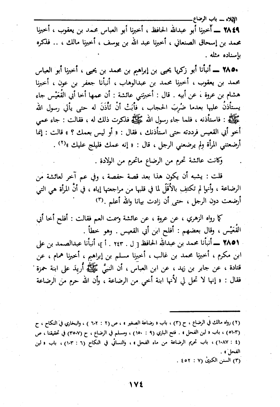 2850 - أَخْبَرَنَا أَبُو عَبْدِ اللَّهِ الْحَافِظُ، ثنا أَبُو الْعَبَّاسِ مُحَمَّدُ بْنُ يَعْقُوبَ، ثنا مُحَمَّدُ بْنُ عَبْدِ الْوَهَّابِ، أَنَا جَعْفَرُ بْنُ عَوْنٍ، أَنَا هِشَامُ بْنُ عُرْوَةَ، عَنْ أَبِيهِ، قَالَ: أَخْبَرَتْنِي عَائِشَةُ أَنَّ عَمَّهَا أَخَا أَبِي الْقُعَيْسِ جَاءَ يَسْتَأْذِنُ عَلَيْهَا بَعْدَ مَا ضُرِبَ الْحِجَابُ، فَأَبَتْ أَنْ تَأْذَنَ لَهُ حَتَّى يَأْتِيَ رَسُولُ اللَّهِ صَلَّى اللهُ عَلَيْهِ وَسَلَّمَ فَتَسْتَأْذِنَ فَلَمَّا جَاءَ رَسُولُ اللَّهِ صَلَّى اللهُ عَلَيْهِ وَسَلَّمَ ذَكَرَتْ ذَلِكَ لَهُ فَقَالَتْ: §جَاءَ عَمِّي أَخُو أَبِي الْقُعَيْسِ فَرَدَدْتُهُ حَتَّى اسْتَأْذَنَكِ فَقَالَ: «أَوَ لَيْسَ بِعَمِّكِ؟» قَالَتْ: إِنَّمَا أَرْضَعَتْنِي الْمَرْأَةُ وَلَمْ يُرْضِعْنِي الرَّجُلُ، قَالَ: «إِنَّهُ عَمُّكِ فَلْيَلِجْ عَلَيْكِ، وَكَانَتْ عَائِشَةُ رَضِيَّ اللَّهُ تَعَالَى عَنْهَا تُحَرِّمُ مِنَ الرَّضَاعِ مَا تُحَرِّمُ مِنَ الْوِلَادَةِ» قُلْتُ: يُشْبِهُ أَنْ يَكُونَ هَذَا بَعْدَ قِصَّةِ حَفْصَةَ، وَفِي عَمٍّ آخَرَ لِعَائِشَةَ مِنَ الرَّضَاعَةِ، وَأَنَّهَا لَمْ تَكْتَفِ بِالْأَوَّلِ لِمَا فِي قَلْبِهَا مِنْ مُرَاجَعَتِهَا إِيَّاهُ فِي أَنَّ الْمَرْأَةَ هِيَ الَّتِي أَرْضَعَتْهُ دُونَ الرَّجُلِ، حَتَّى ازْدَادَتْ بَيَانًا، وَاللَّهُ أَعْلَمُ " رَوَاهُ الزُّهْرِيُّ، عَنْ عُرْوَةَ، عَنْ عَائِشَةَ وَسَمَّتِ الْعَمَّ فَقَالَتْ: «أَفْلَحَ أَخَا أَبِي الْقُعَيْسِ» وَقَالَ بَعْضُهُمْ: ابْنُ أَبِي الْقُعَيْسِ وَهُوَ خَطَأٌ