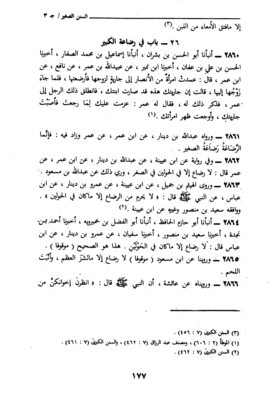 2862 - وَفِي رِوَايَةِ ابْنِ عُيَيْنَةَ، عَنْ عَبْدِ اللَّهِ بْنِ دِينَارٍ، عَنِ ابْنِ عُمَرَ، عَنْ عُمَرَ قَالَ: «لَا رَضَاعَ إِلَّا فِي الْحَوْلَيْنِ فِي الصِّغَرِ» وَرُوِيَ ذَلِكَ عَنْ عَبْدِ اللَّهِ بْنِ مَسْعُودٍ